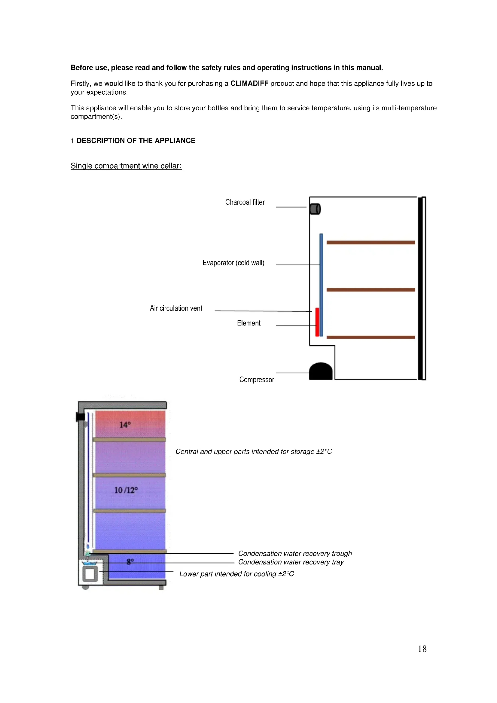Central and upper parts intended for storage ±2°C Charcoal filter Evaporator (cold wall) Element Air circulation vent Compressor Condensation water recovery trough Condensation water recovery tray Lower part intended for cooling ±2°C19 Multi-compartment wine cellar: