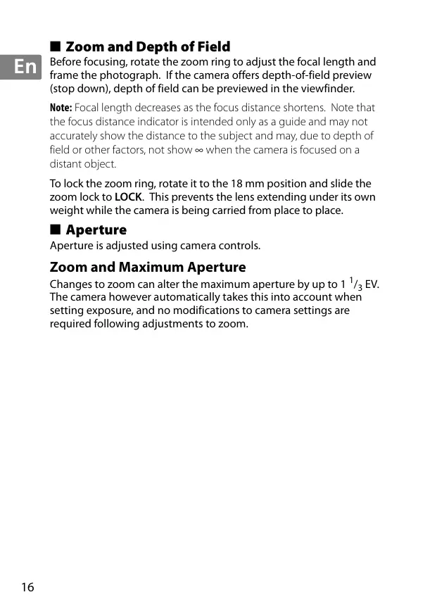 (stop down), depth of field can be previewed in the viewfinder. Note: Focal length decreases as the focus distance shortens. Note that the focus distance indicator is intended only as a guide and may not accurately show the distance to the subject and may, due to depth of field or other factors, not show ∞ when the camera is focused on a distant object. To lock the zoom ring, rotate it to the 18 mm position and slide the zoom lock to LOCK. This prevents the lens extending under its own weight while the camera is being carried from place to place.