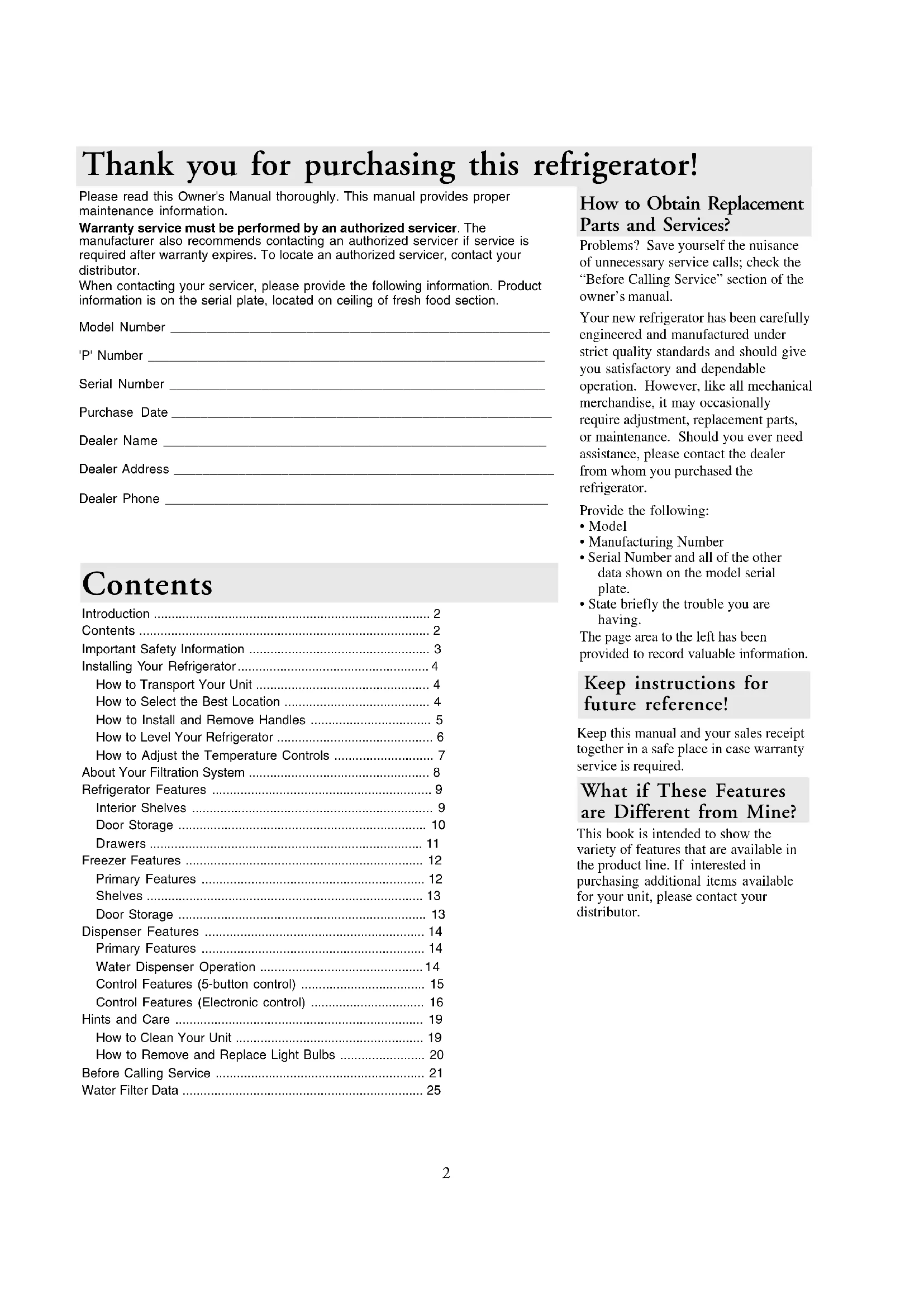 Your new refrigerator has been carefully engineered and manufactured under strict quality standards and should give you satisfactory and dependable operation. However, like all mechanical merchandise, it may occasionally require adjustment, replacement parts, or maintenance. Should you ever need assistance, please contact the dealer from whom you purchased the refrigerator.