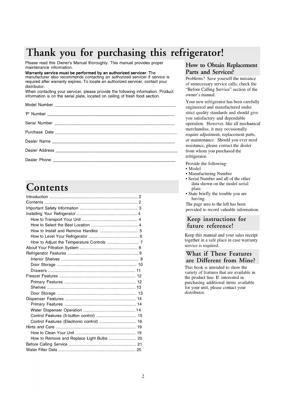 - Türkçe Part No. 12591314 Printed in U.S.A. 07/02 Side by Side Refrigerator2 Please read this Owner's Manual thoroughly. This manual provides proper maintenance information. Warranty service must be performed by an authorized servicer. The manufacturer also recommends contacting an authorized servicer if service is required after warranty expires. To locate an authorized servicer, contact your distributor. When contacting your servicer, please provide the following information. Product information is on the serial plate, located on ceiling of fresh food section. Model Number _____________________________________________________ 'P' Number ________________________________________________________ Serial Number _____________________________________________________ Purchase Date _____________________________________________________ Dealer Name ______________________________________________________ Dealer Address _____________________________________________________ Dealer Phone ______________________________________________________ How to Obtain Replacement Parts and Services? Problems? Save yourself the nuisance of unnecessary service calls; check the “Before Calling Service” section of the owner’s manual. Your new refrigerator has been carefully engineered and manufactured under strict quality standards and should give you satisfactory and dependable operation. However, like all mechanical merchandise, it may occasionally require adjustment, replacement parts, or maintenance. Should you ever need assistance, please contact the dealer from whom you purchased the refrigerator. Provide the following: p. 291