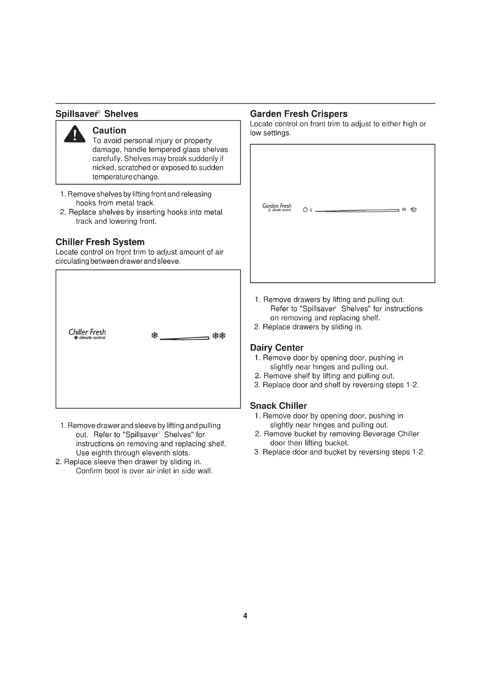 track and lowering front. Chiller Fresh System Locate control on front trim to adjust amount of air circulating between drawer and sleeve. Garden Fresh Crispers Locate control on front trim to adjust to either high or low settings.