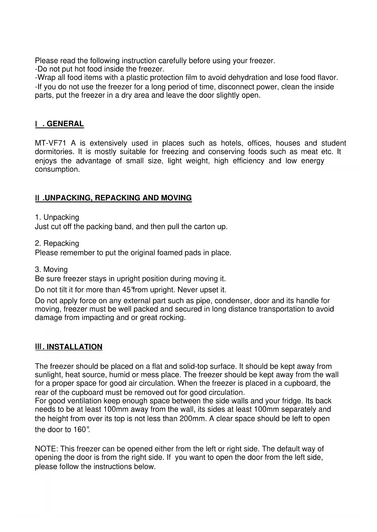. INSTALLATION The freezer should be placed on a flat and solid-top surface. It should be kept away from sunlight, heat source, humid or mess place. The freezer should be kept away from the wall for a proper space for good air circulation. When the freezer is placed in a cupboard, the rear of the cupboard must be removed out for good circulation. For good ventilation keep enough space between the side walls and your fridge. Its back needs to be at least 100mm away from the wall, its sides at least 100mm separately and the height from over its top is not less than 200mm. A clear space should be left to open the door to 160 . NOTE: This freezer can be opened either from the left or right side. The default way of opening the door is from the right side. If you want to open the door from the left side, please follow the instructions below.- 8 -