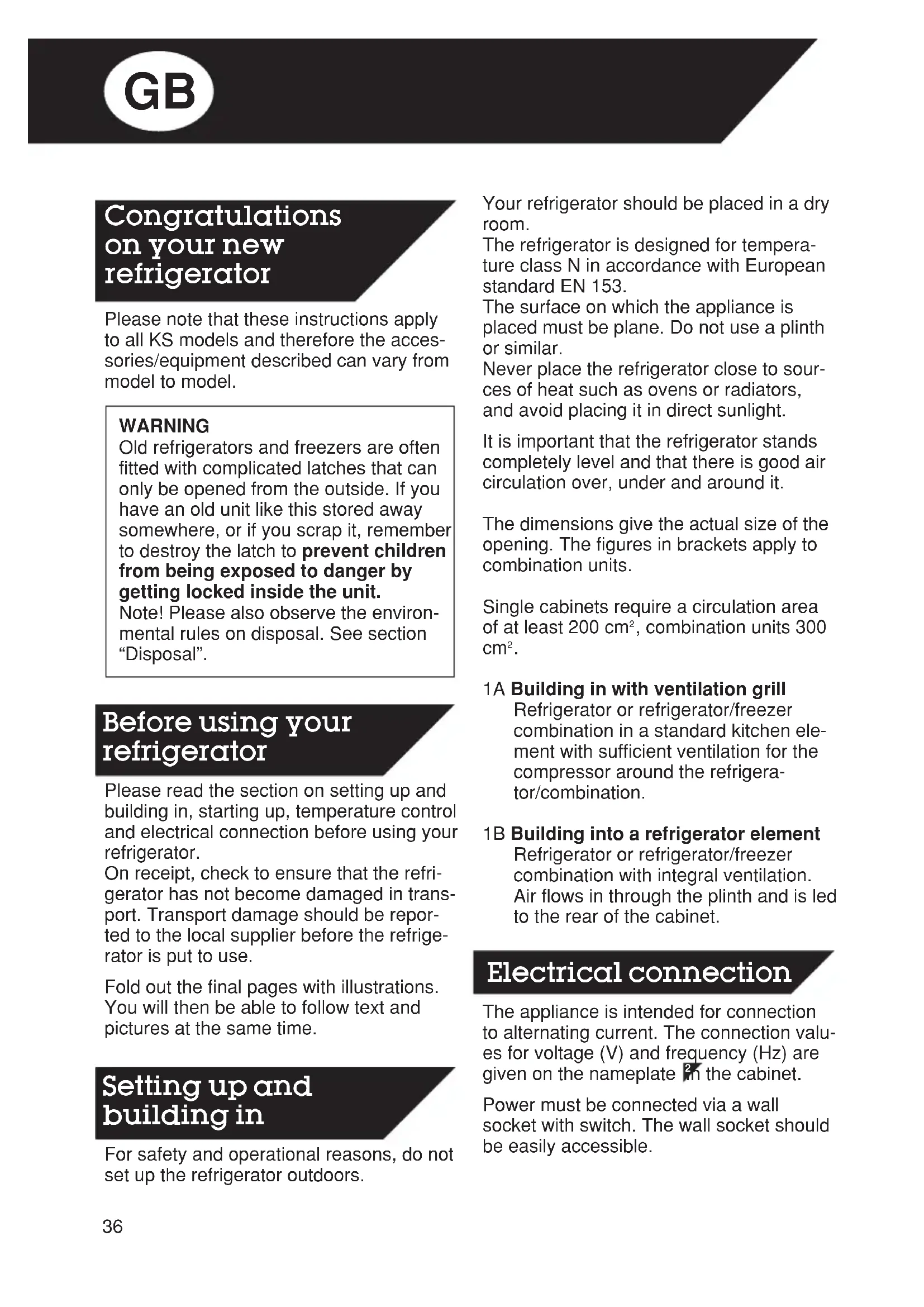 Please note that these instructions apply to all KS models and therefore the acces- sories/equipment described can vary from model to model. WARNING Old refrigerators and freezers are often fitted with complicated latches that can only be opened from the outside. If you have an old unit like this stored away somewhere, or if you scrap it, remember to destroy the latch to prevent children from being exposed to danger by getting locked inside the unit. Note! Please also observe the environ- mental rules on disposal. See section “Disposal”. Please read the section on setting up and building in, starting up, temperature control and electrical connection before using your refrigerator. On receipt, check to ensure that the refri- gerator has not become damaged in trans- port. Transport damage should be repor- ted to the local supplier before the refrige- rator is put to use. Fold out the final pages with illustrations. You will then be able to follow text and pictures at the same time. For safety and operational reasons, do not set up the refrigerator outdoors. Your refrigerator should be placed in a dry room. The refrigerator is designed for tempera- ture class N in accordance with European standard EN 153. The surface on which the appliance is placed must be plane. Do not use a plinth or similar. Never place the refrigerator close to sour- ces of heat such as ovens or radiators, and avoid placing it in direct sunlight. It is important that the refrigerator stands completely level and that there is good air circulation over, under and around it. The dimensions give the actual size of the opening. The figures in brackets apply to combination units. Single cabinets require a circulation area of at least 200 cm