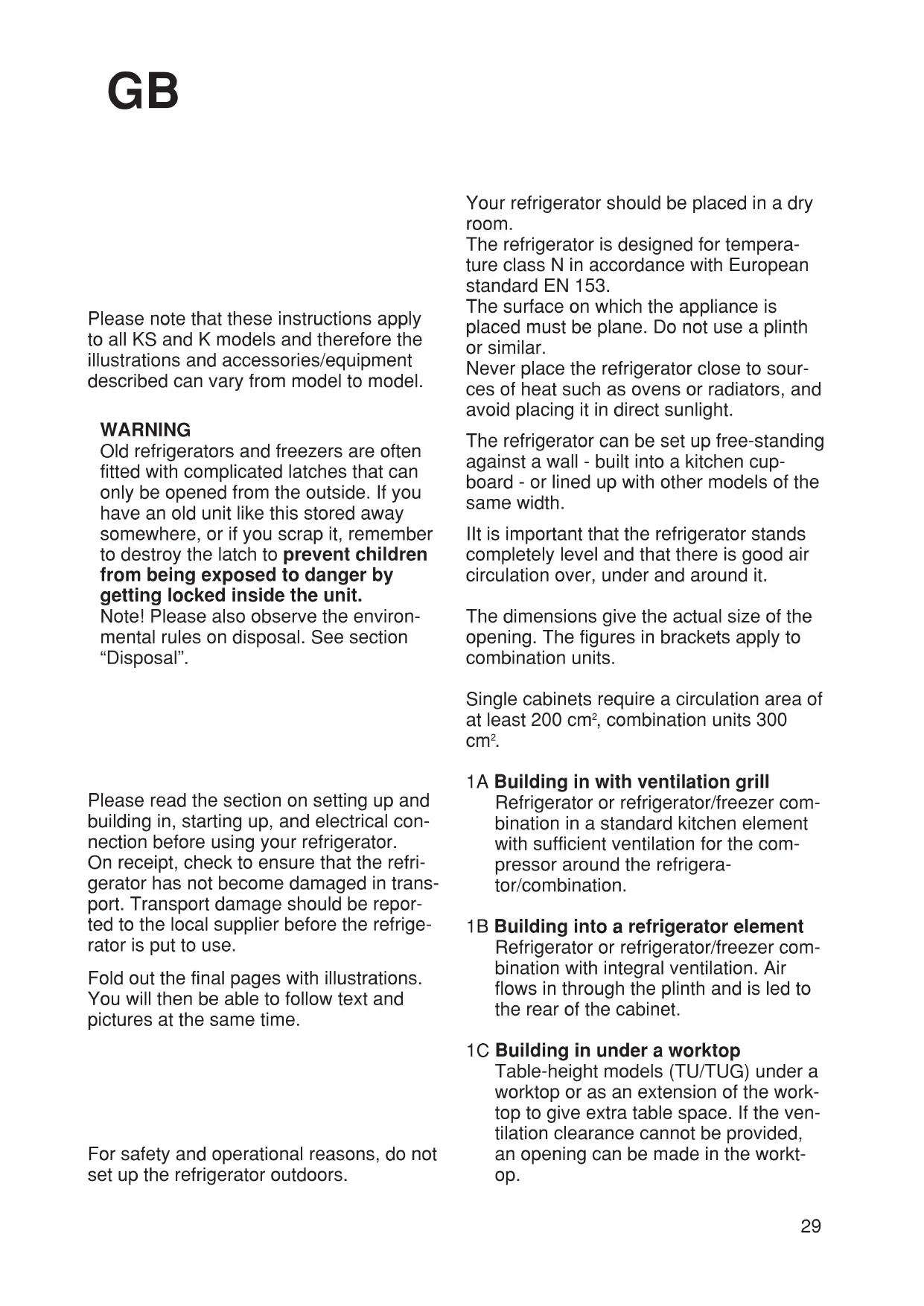 Please note that these instructions apply to all KS and K models and therefore the illustrations and accessories/equipment described can vary from model to model. WARNING Old refrigerators and freezers are often fitted with complicated latches that can only be opened from the outside. If you have an old unit like this stored away somewhere, or if you scrap it, remember to destroy the latch to prevent children from being exposed to danger by getting locked inside the unit. Note! Please also observe the environ- mental rules on disposal. See section “Disposal”. Please read the section on setting up and building in, starting up, and electrical con- nection before using your refrigerator. On receipt, check to ensure that the refri- gerator has not become damaged in trans- port. Transport damage should be repor- ted to the local supplier before the refrige- rator is put to use. Fold out the final pages with illustrations. You will then be able to follow text and pictures at the same time. For safety and operational reasons, do not set up the refrigerator outdoors. Your refrigerator should be placed in a dry room. The refrigerator is designed for tempera- ture class N in accordance with European standard EN 153. The surface on which the appliance is placed must be plane. Do not use a plinth or similar. Never place the refrigerator close to sour- ces of heat such as ovens or radiators, and avoid placing it in direct sunlight. The refrigerator can be set up free-standing against a wall - built into a kitchen cup- board - or lined up with other models of the same width. IIt is important that the refrigerator stands completely level and that there is good air circulation over, under and around it. The dimensions give the actual size of the opening. The figures in brackets apply to combination units. Single cabinets require a circulation area of at least 200 cm