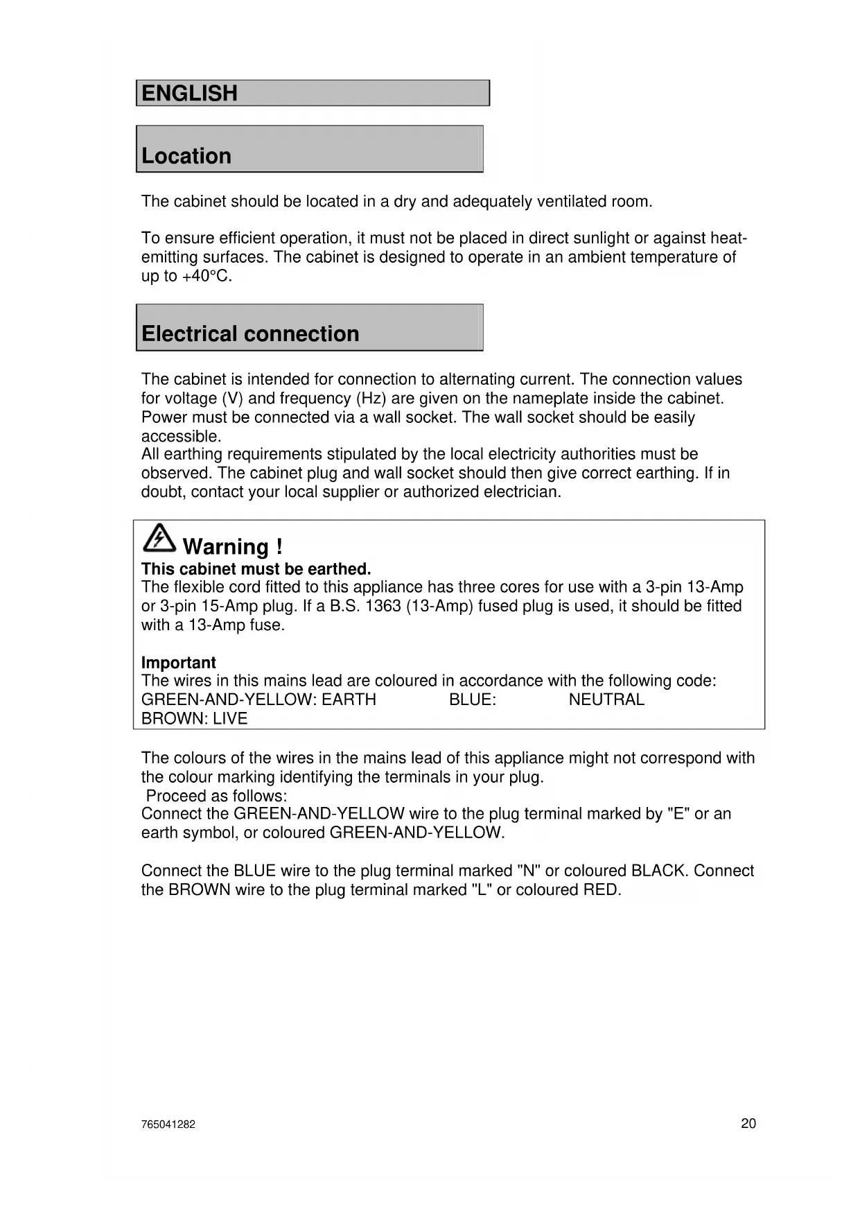 BROWN: LIVE The colours of the wires in the mains lead of this appliance might not correspond with the colour marking identifying the terminals in your plug. Proceed as follows: Connect the GREEN-AND-YELLOW wire to the plug terminal marked by "E" or an earth symbol, or coloured GREEN-AND-YELLOW. Connect the BLUE wire to the plug terminal marked "N" or coloured BLACK. Connect the BROWN wire to the plug terminal marked "L" or coloured RED.765041282 21
