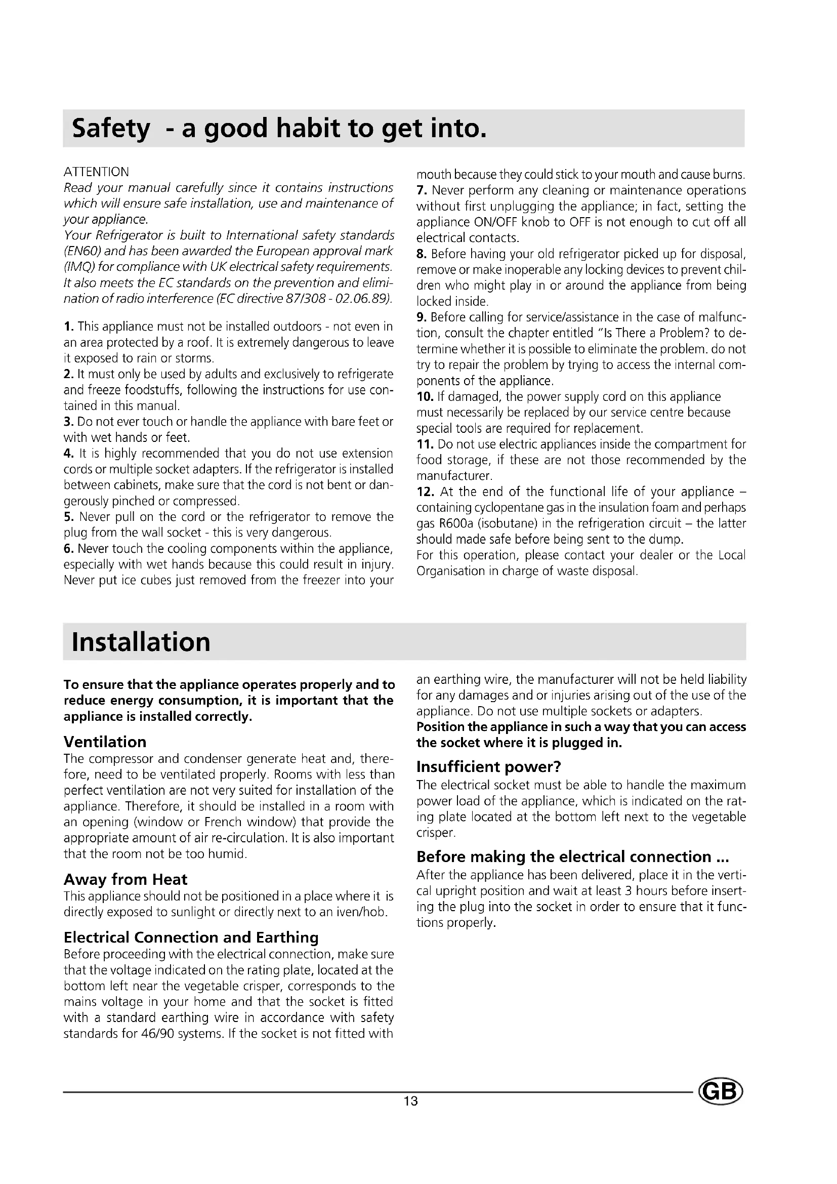 containing cyclopentane gas in the insulation foam and perhaps gas R600a (isobutane) in the refrigeration circuit – the latter should made safe before being sent to the dump. For this operation, please contact your dealer or the Local Organisation in charge of waste disposal. ATTENTION Read your manual carefully since it contains instructions which will ensure safe installation, use and maintenance of your appliance. Your Refrigerator is built to International safety standards (EN60) and has been awarded the European approval mark (IMQ) for compliance with UK electrical safety requirements. It also meets the EC standards on the prevention and elimi- nation of radio interference (EC directive 87/308 - 02.06.89).