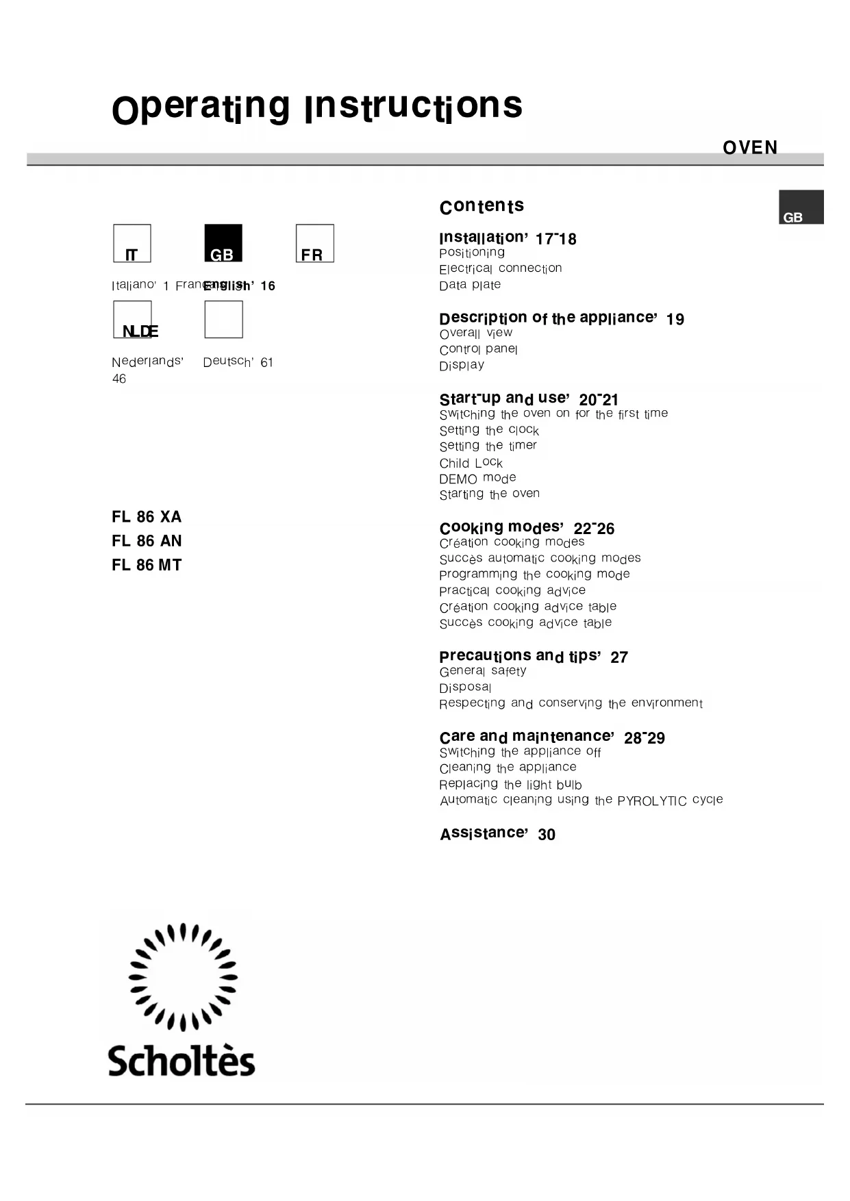 FL 86 XA MT - Oven SCHOLTES - Free user manual and instructions