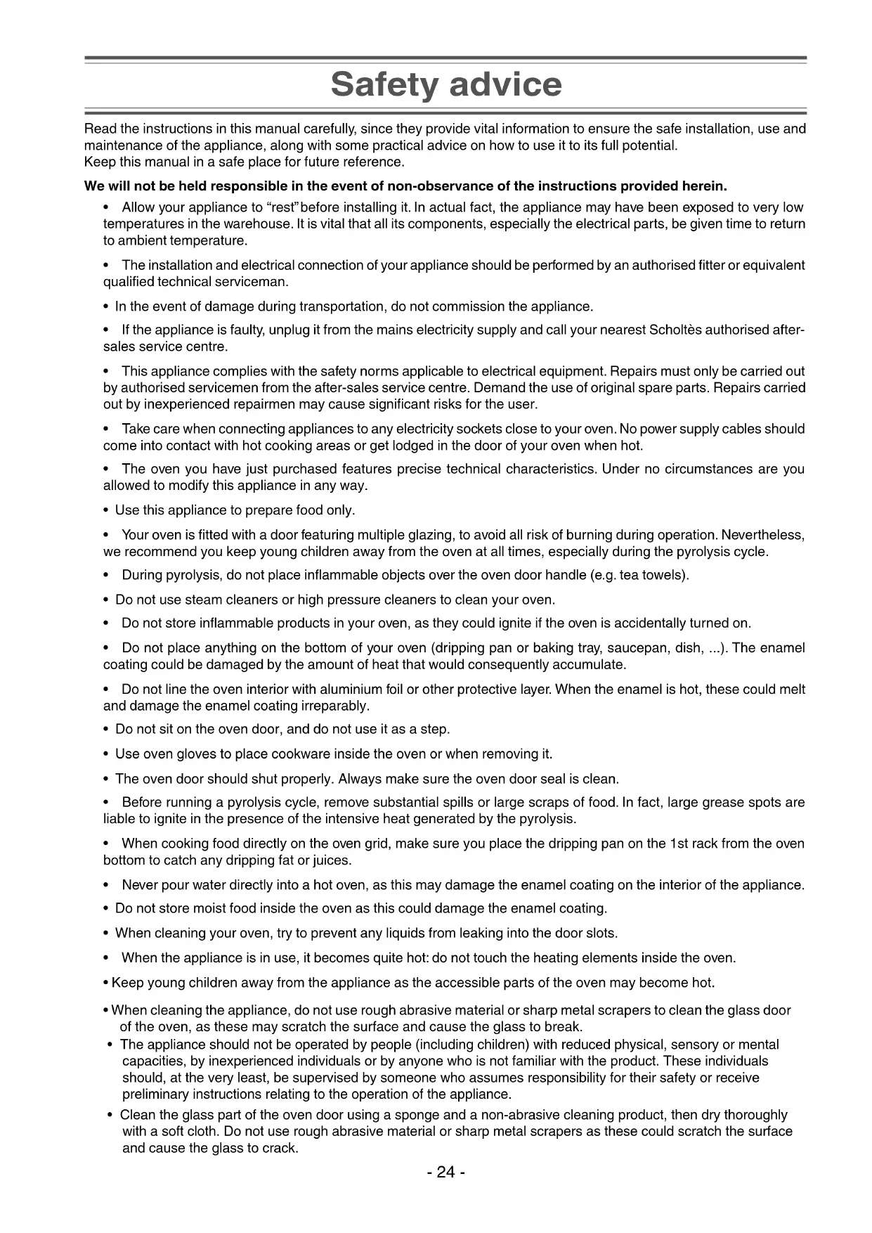 - the User’s guide simply illustrates the various features of your new appliance. It contains some cooking advice, which should help you use your oven to its full potential. Enjoy cooking with SCHOLTES- 23 - Table of contents Safety advice ................................................................................................................................ 24 Installation & Fastening ............................................................................................................... 25 Installation ................................................................................................................................................ 25 Fastening .................................................................................................................................................. 25 Electrical connection ................................................................................................................... 26 Technical data sheet .................................................................................................................... 27 Appliance care.........................................................................................................................28-29 General comments ................................................................................................................................... 28 Disassembling the oven door ................................................................................................................... 28 Oven door seal ......................................................................................................................................... 28 Appliance exterior ..................................................................................................................................... 28 Glass oven light cover .............................................................................................................................. 28 Replacing the light bulb ............................................................................................................................ 28 The accessories ....................................................................................................................................... 29 Catalytic cleaning ......................................................................................................................... 29 Manual cleaning ........................................................................................................................... 29 Pyrolysis .......................................................................................................................................30 Protecting the environment ......................................................................................................... 31 Maintenance.................................................................................................................................. 31 Inhoud .......................................................................................................................... bladzijde 32 Indice ................................................................................................................................ pagina 42- 24 - Safety advice Read the instructions in this manual carefully, since they provide vital information to ensure the safe installation, use and maintenance of the appliance, along with some practical advice on how to use it to its full potential. Keep this manual in a safe place for future reference. We will not be held responsible in the event of non-observance of the instructions provided herein.