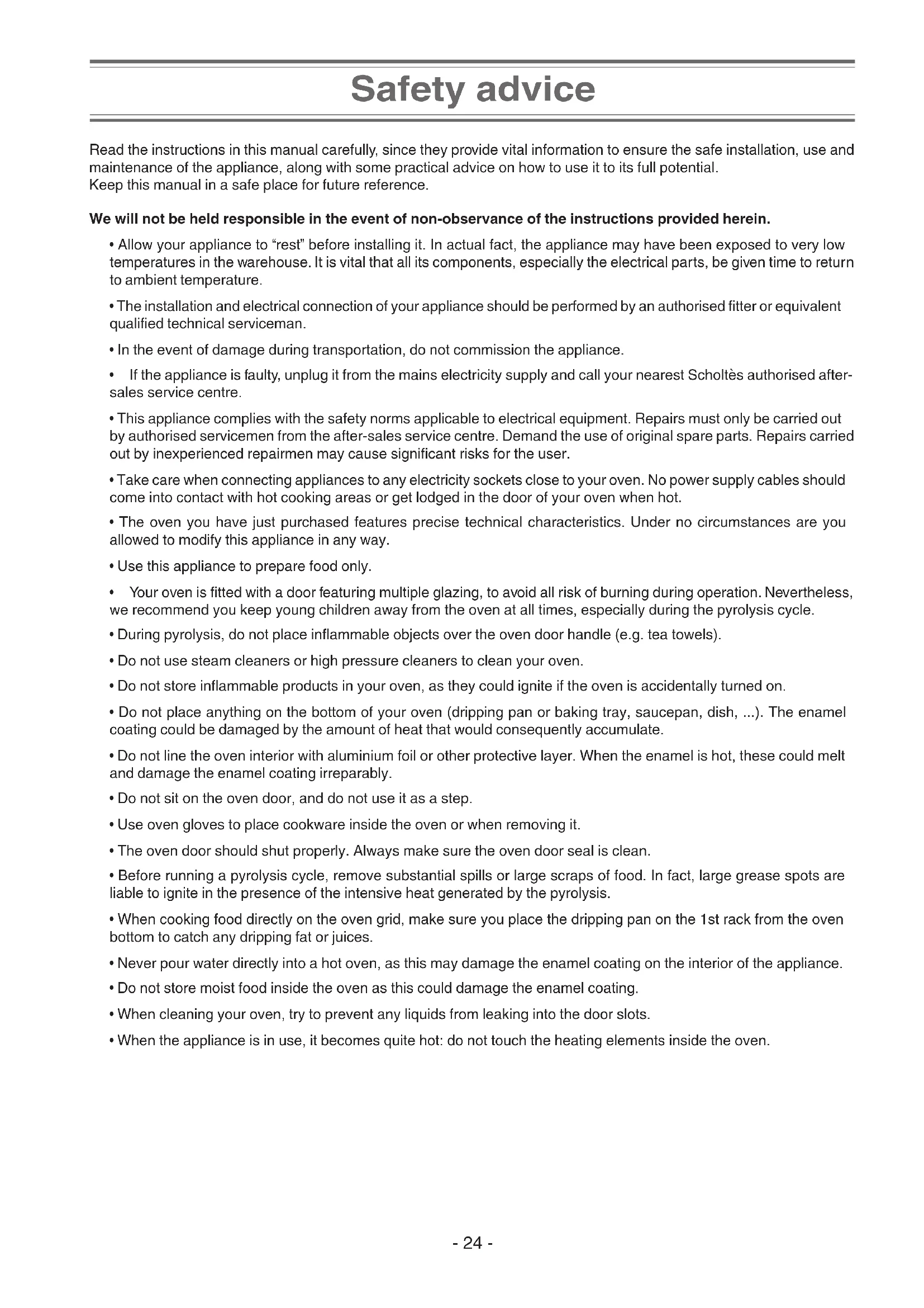 - the User’s guide simply illustrates the various features of your new appliance. It contains some cooking advice, which should help you use your oven to its full potential. Enjoy cooking with SCHOLTES- 23 - Table of contents Safety advice ................................................................................................................................ 24 Installation & Fastening ............................................................................................................... 25 Installation ................................................................................................................................................ 25 Fastening .................................................................................................................................................. 25 Electrical connection ................................................................................................................... 26 Technical data sheet .................................................................................................................... 27 Appliance care.........................................................................................................................28-29 General comments ................................................................................................................................... 28 Disassembling the oven door ................................................................................................................... 28 Oven door seal ......................................................................................................................................... 28 Appliance exterior ..................................................................................................................................... 28 Glass oven light cover .............................................................................................................................. 28 Replacing the light bulb ............................................................................................................................ 28 The accessories ....................................................................................................................................... 29 Catalytic cleaning ......................................................................................................................... 29 Manual cleaning ........................................................................................................................... 29 Pyrolysis .......................................................................................................................................30 Protecting the environment ......................................................................................................... 31 Maintenance.................................................................................................................................. 31 Inhoud .......................................................................................................................... bladzijde 32 Indice ................................................................................................................................ pagina 42- 24 - Safety advice Read the instructions in this manual carefully, since they provide vital information to ensure the safe installation, use and maintenance of the appliance, along with some practical advice on how to use it to its full potential. Keep this manual in a safe place for future reference. We will not be held responsible in the event of non-observance of the instructions provided herein.