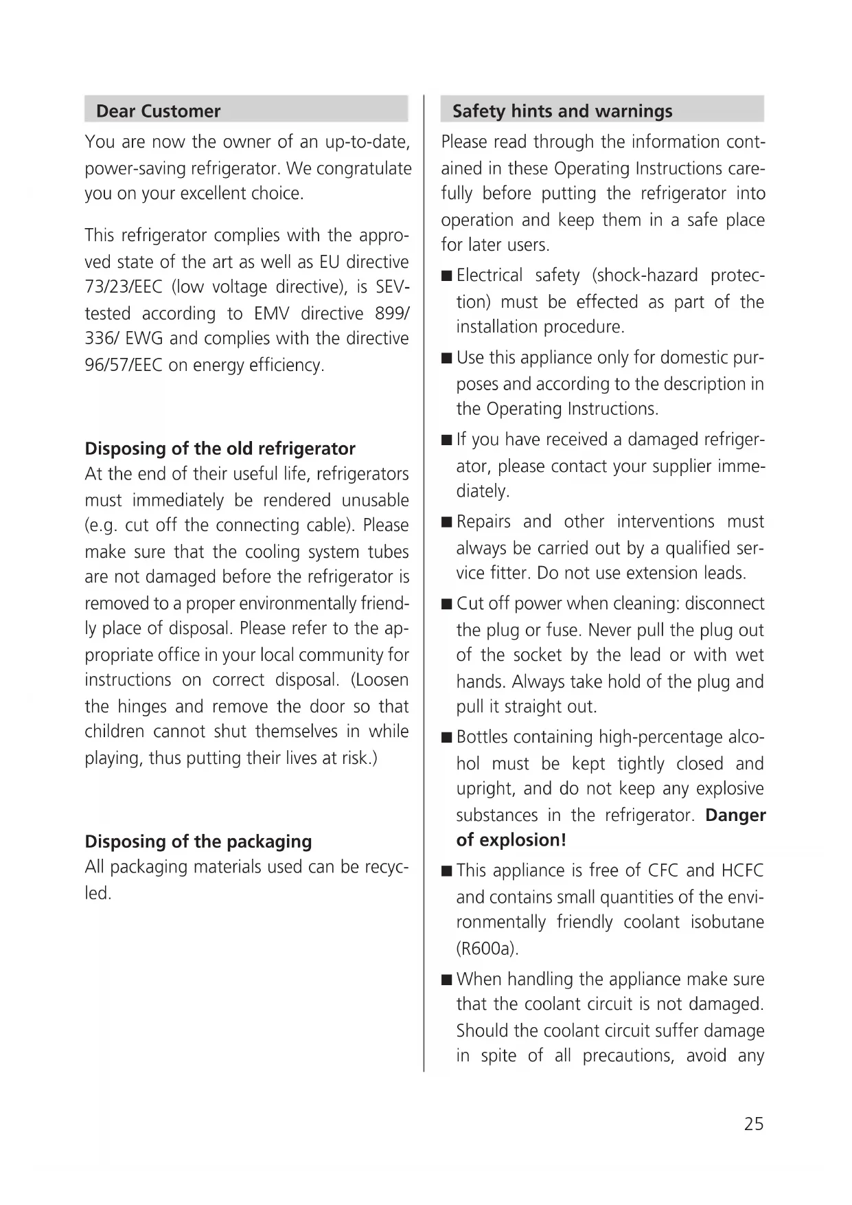This refrigerator complies with the approved state of the art as well as EU directive 73/23/EEC (low voltage directive), is SEV-tested according to EMV directive 899/336/ EwG and complies with the directive 96/57/EEC on energy efficiency.