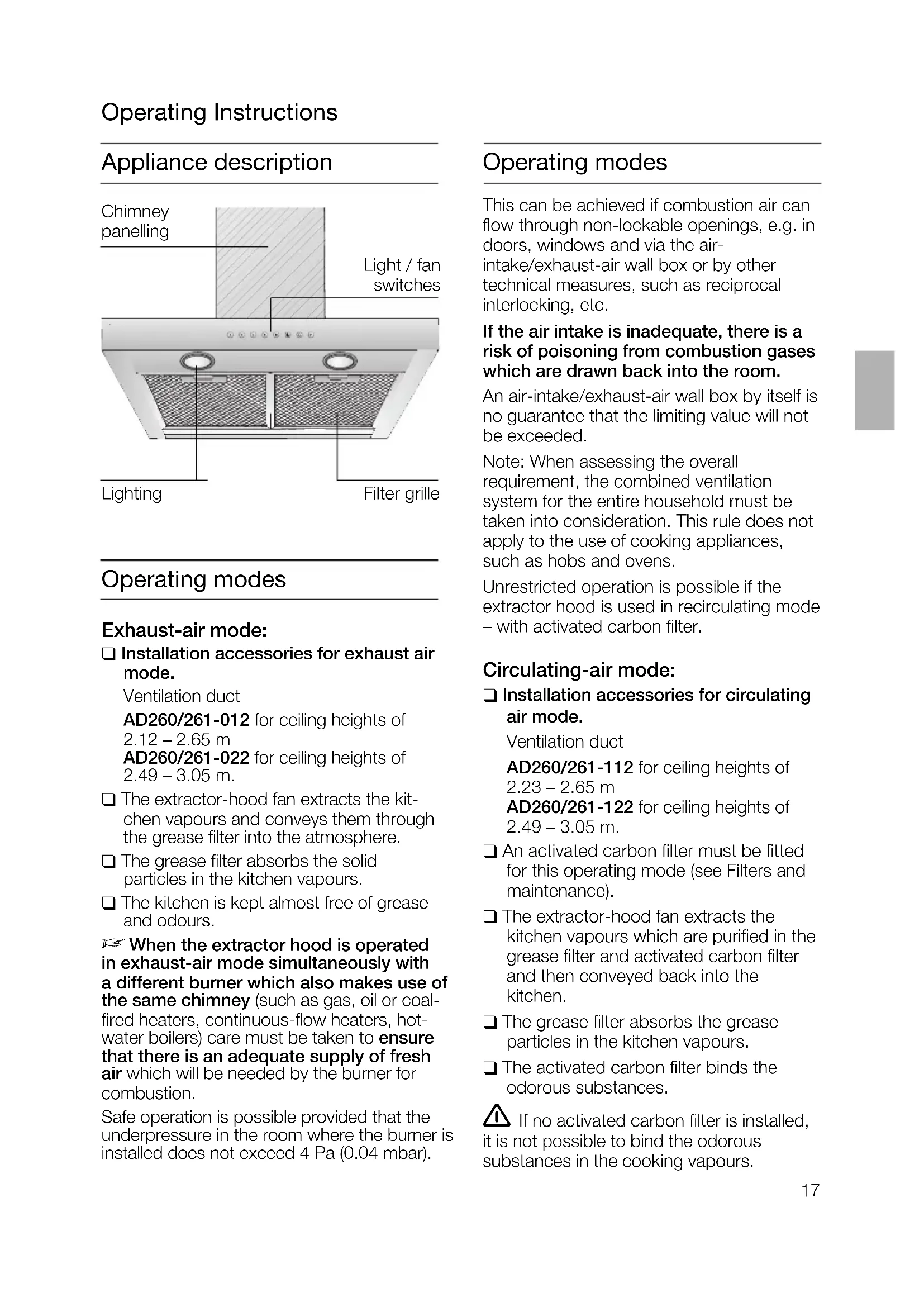 schrauben) eindrehen.17 Appliance description Operating Instructions Operating modes Operating modes Exhaust-air mode: ❑ Installation accessories for exhaust air mode. Ventilation duct AD260/261-012 for ceiling heights of