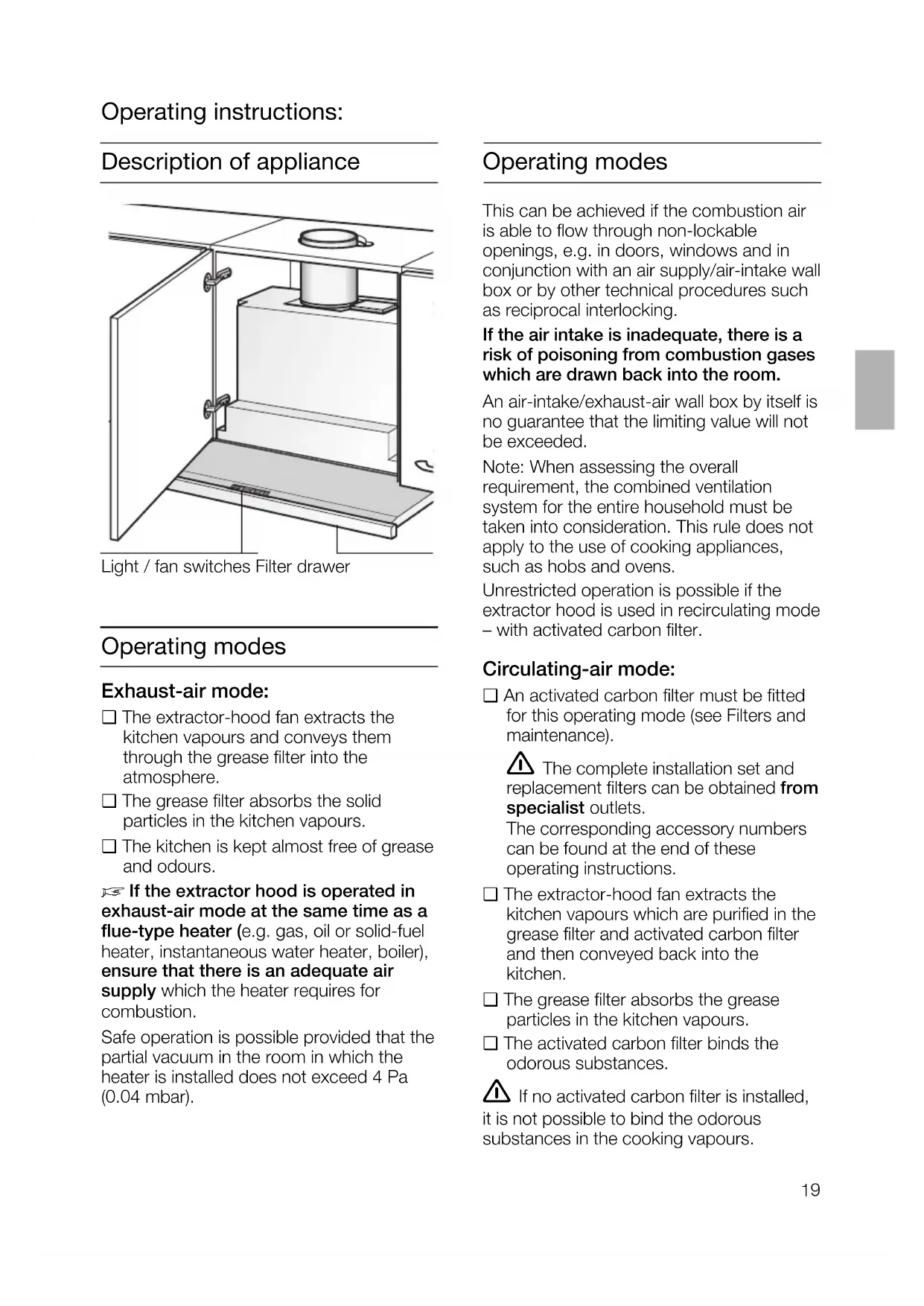 Die Anzeige erlischt nach kurzer Zeit. Umstellung der elektronischen Steuerung auf Umluftbetrieb: ❑ Serienmäßige Einstellung ist Abluftbetrieb. ❑ Die Dunstabzugshaube muss angeschlossen und ausgeschaltet sein.19 Operating modes This can be achieved if the combustion air is able to flow through non-lockable openings, e.g. in doors, windows and in conjunction with an air supply/air-intake wall box or by other technical procedures such as reciprocal interlocking. If the air intake is inadequate, there is a risk of poisoning from combustion gases which are drawn back into the room. An air-intake/exhaust-air wall box by itself is no guarantee that the limiting value will not be exceeded. Note: When assessing the overall requirement, the combined ventilation system for the entire household must be taken into consideration. This rule does not apply to the use of cooking appliances, such as hobs and ovens. Unrestricted operation is possible if the extractor hood is used in recirculating mode – with activated carbon filter. Circulating-air mode: ❑ An activated carbon filter must be fitted for this operating mode (see Filters and maintenance). The complete installation set and replacement filters can be obtained from specialist outlets. The corresponding accessory numbers can be found at the end of these operating instructions. ❑ The extractor-hood fan extracts the kitchen vapours which are purified in the grease filter and activated carbon filter and then conveyed back into the kitchen. ❑ The grease filter absorbs the grease particles in the kitchen vapours. ❑ The activated carbon filter binds the odorous substances. If no activated carbon filter is installed, it is not possible to bind the odorous substances in the cooking vapours. Light / fan switches Filter drawer Description of appliance Operating instructions: Operating modes Exhaust-air mode: ❑ The extractor-hood fan extracts the kitchen vapours and conveys them through the grease filter into the atmosphere. ❑ The grease filter absorbs the solid particles in the kitchen vapours. ❑ The kitchen is kept almost free of grease and odours.