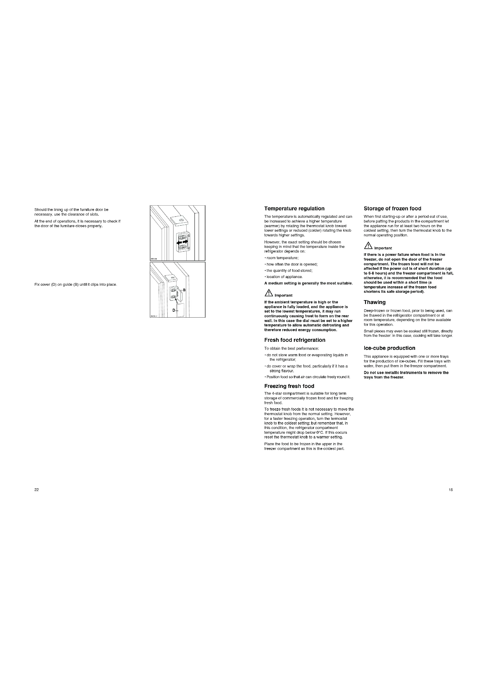 Should the lining up of the furniture door be necessary, use the clearance of slots. At the end of operations, it is necessary to check if the door of the furniture closes properly. Fix cover (D) on guide (B) until it clips into place.16 Hints for storage of frozen food To obtain the best performance from this appliance, you should: