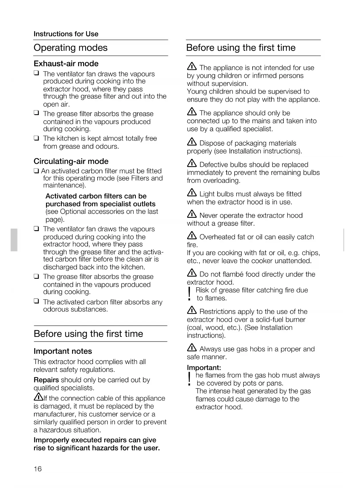 The activated carbon filter absorbs any odorous substances. Before using the first time Important notes This extractor hood complies with all relevant safety regulations. Repairs should only be carried out by qualified specialists. If the connection cable of this appliance is damaged, it must be replaced by the manufacturer, his customer service or a similarly qualified person in order to prevent a hazardous situation. Improperly executed repairs can give rise to significant hazards for the user. Operating modes Instructions for Use Before using the first time17 The most effective method of remo- ving vapours produced during cooking is to:
