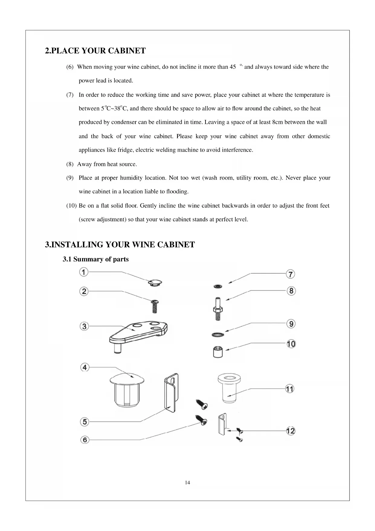 C, and there should be space to allow air to flow around the cabinet, so the heat produced by condenser can be eliminated in time. Leaving a space of at least 8cm between the wall and the back of your wine cabinet. Please keep your wine cabinet away from other domestic appliances like fridge, electric welding machine to avoid interference. (8) Away from heat source. (9) Place at proper humidity location. Not too wet (wash room, utility room, etc.). Never place your wine cabinet in a location liable to flooding. (10) Be on a flat solid floor. Gently incline the wine cabinet backwards in order to adjust the front feet (screw adjustment) so that your wine cabinet stands at perfect level.