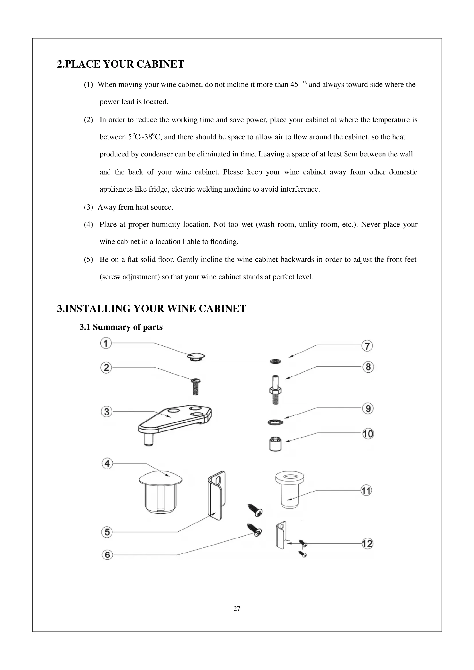 C, and there should be space to allow air to flow around the cabinet, so the heat produced by condenser can be eliminated in time. Leaving a space of at least 8cm between the wall and the back of your wine cabinet. Please keep your wine cabinet away from other domestic appliances like fridge, electric welding machine to avoid interference. (3) Away from heat source. (4) Place at proper humidity location. Not too wet (wash room, utility room, etc.). Never place your wine cabinet in a location liable to flooding. (5) Be on a flat solid floor. Gently incline the wine cabinet backwards in order to adjust the front feet (screw adjustment) so that your wine cabinet stands at perfect level.