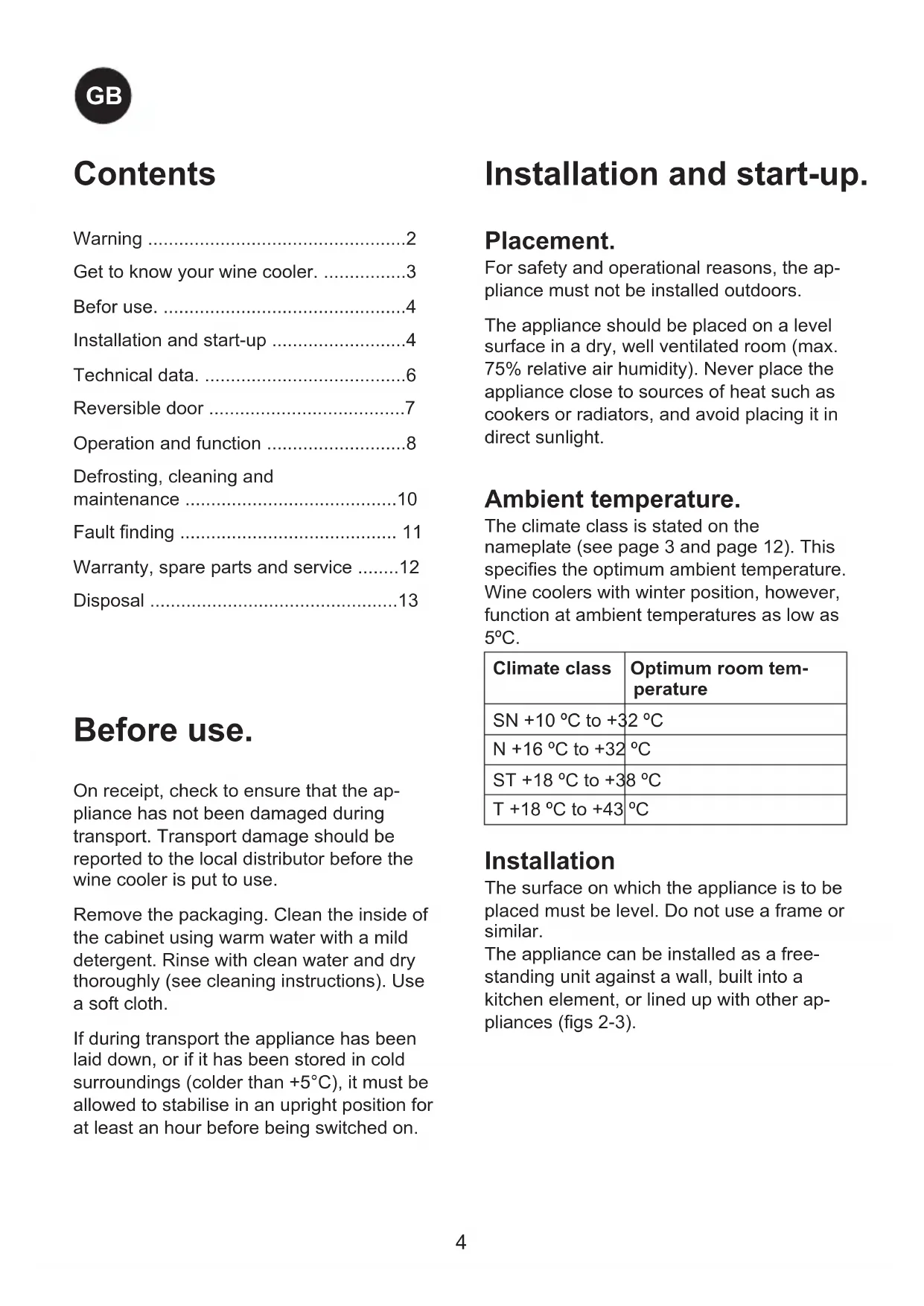 - Disposal Contents On receipt, check to ensure that the ap- pliance has not been damaged during transport. Transport damage should be reported to the local distributor before the wine cooler is put to use. Remove the packaging. Clean the inside of the cabinet using warm water with a mild detergent. Rinse with clean water and dry thoroughly (see cleaning instructions). Use a soft cloth. If during transport the appliance has been laid down, or if it has been stored in cold surroundings (colder than +5°C), it must be allowed to stabilise in an upright position for at least an hour before being switched on. Beforeuse.5 p. 13