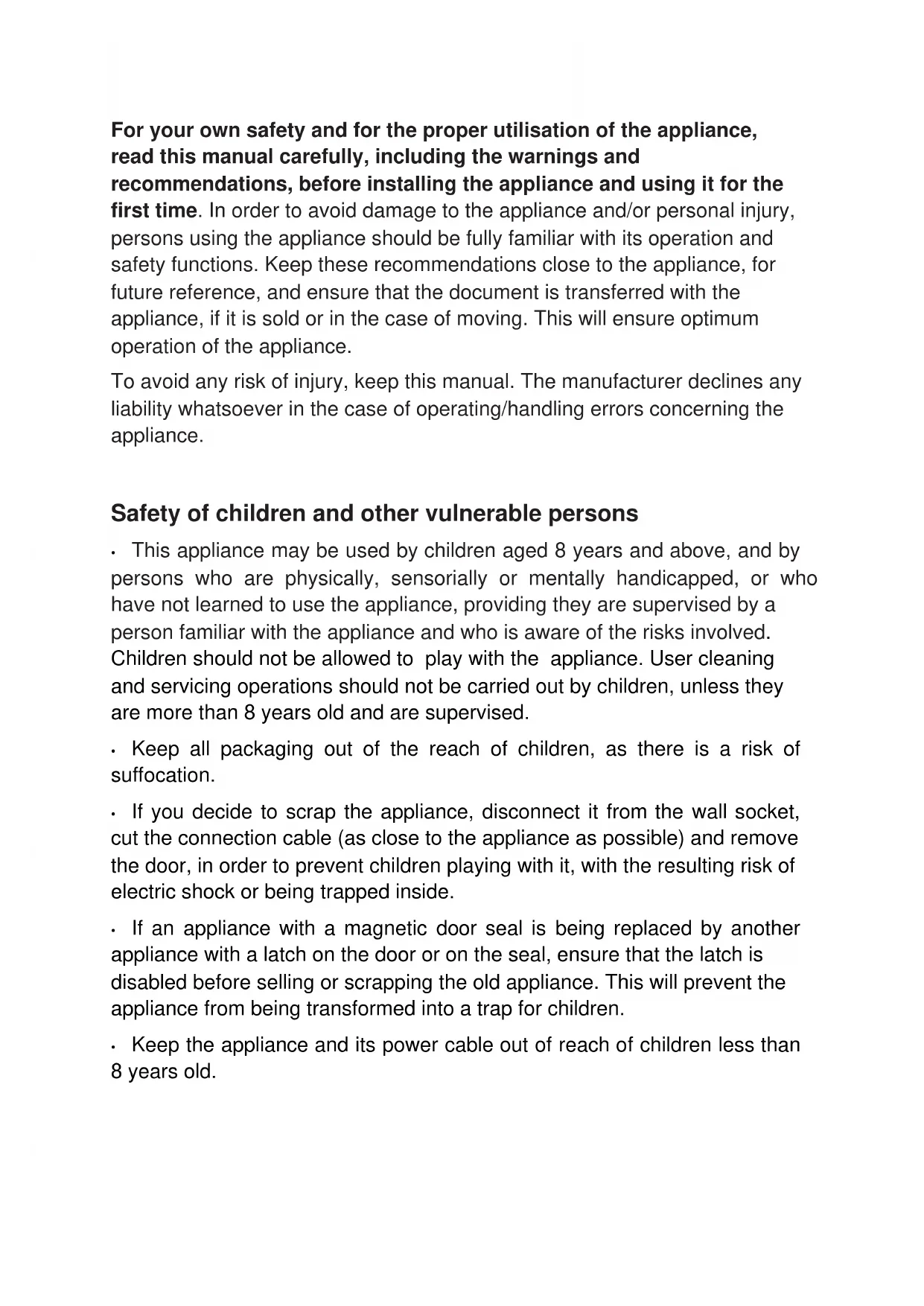 - If you decide to scrap the appliance, disconnect it from the wall socket, cut the connection cable (as close to the appliance as possible) and remove the door, in order to prevent children playing with it, with the resulting risk of electric shock or being trapped inside.