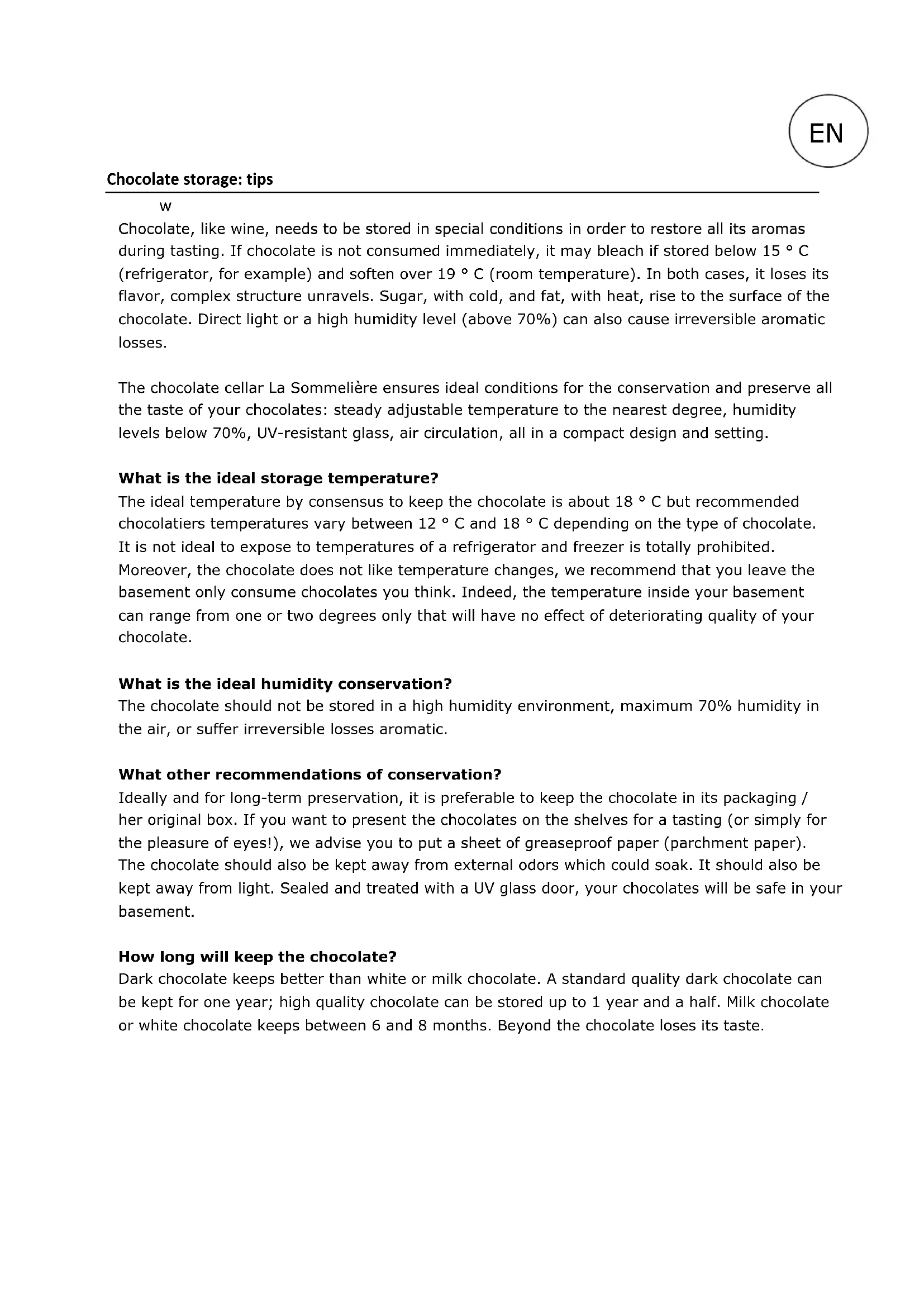 FRChocolate storage: tips Chocolate, like wine, needs to be stored in special conditions in order to restore all its aromas during tasting. If chocolate is not consumed immediately, it may bleach if stored below 15 ° C (refrigerator, for example) and soften over 19 ° C (room temperature). In both cases, it loses its flavor, complex structure unravels. Sugar, with cold, and fat, with heat, rise to the surface of the chocolate. Direct light or a high humidity level (above 70%) can also cause irreversible aromatic losses. The chocolate cellar La Sommelière ensures ideal conditions for the conservation and preserve all the taste of your chocolates: steady adjustable temperature to the nearest degree, humidity levels below 70%, UV-resistant glass, air circulation, all in a compact design and setting. What is the ideal storage temperature? The ideal temperature by consensus to keep the chocolate is about 18 ° C but recommended chocolatiers temperatures vary between 12 ° C and 18 ° C depending on the type of chocolate. It is not ideal to expose to temperatures of a refrigerator and freezer is totally prohibited. Moreover, the chocolate does not like temperature changes, we recommend that you leave the basement only consume chocolates you think. Indeed, the temperature inside your basement can range from one or two degrees only that will have no effect of deteriorating quality of your chocolate. What is the ideal humidity conservation? The chocolate should not be stored in a high humidity environment, maximum 70% humidity in the air, or suffer irreversible losses aromatic. What other recommendations of conservation? Ideally and for long-term preservation, it is preferable to keep the chocolate in its packaging / her original box. If you want to present the chocolates on the shelves for a tasting (or simply for the pleasure of eyes!), we advise you to put a sheet of greaseproof paper (parchment paper). The chocolate should also be kept away from external odors which could soak. It should also be kept away from light. Sealed and treated with a UV glass door, your chocolates will be safe in your basement. How long will keep the chocolate? Dark chocolate keeps better than white or milk chocolate. A standard quality dark chocolate can be kept for one year; high quality chocolate can be stored up to 1 year and a half. Milk chocolate or white chocolate keeps between 6 and 8 months. Beyond the chocolate loses its taste.