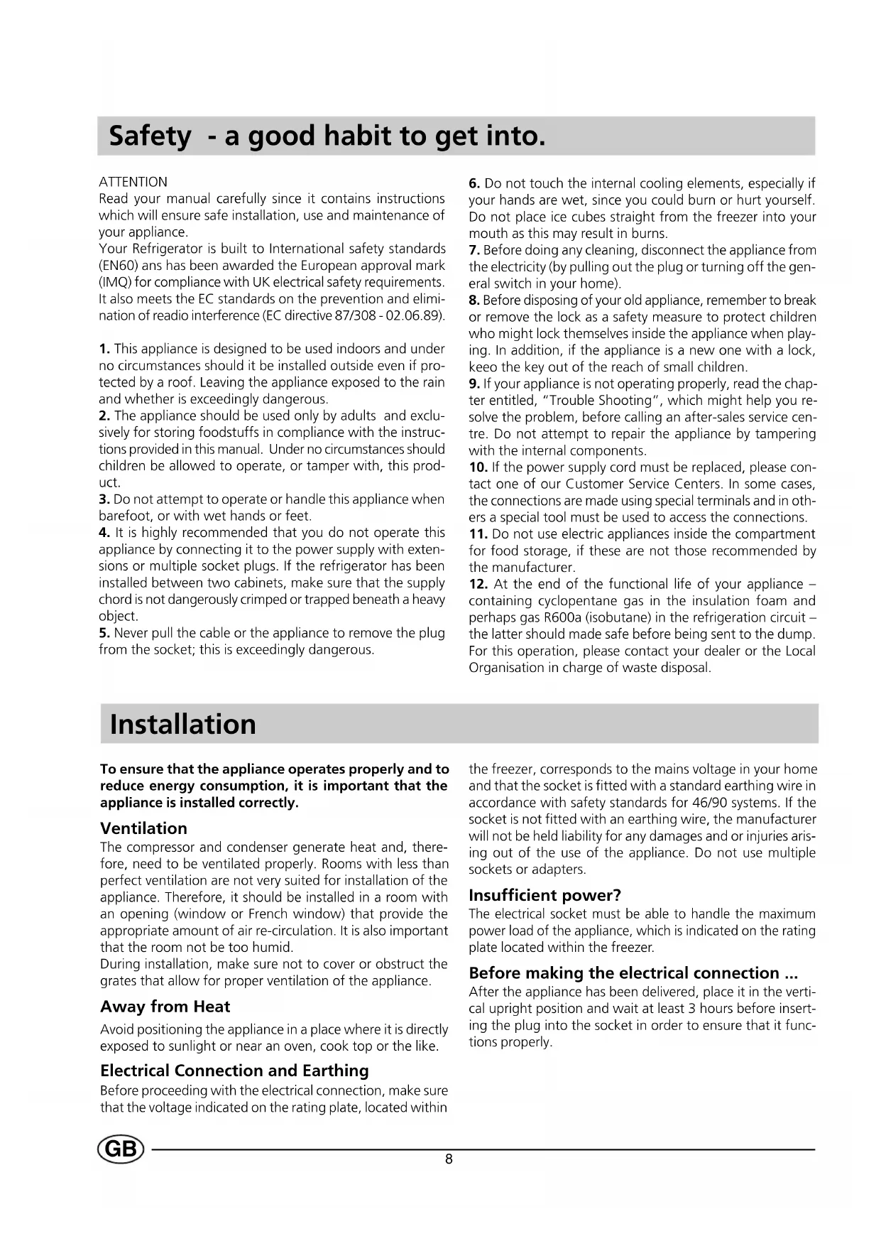 containing cyclopentane gas in the insulation foam and perhaps gas R600a (isobutane) in the refrigeration circuit – the latter should made safe before being sent to the dump. For this operation, please contact your dealer or the Local Organisation in charge of waste disposal. Safety - a good habit to get into. To ensure that the appliance operates properly and to reduce energy consumption, it is important that the appliance is installed correctly. Ventilation The compressor and condenser generate heat and, there- fore, need to be ventilated properly. Rooms with less than perfect ventilation are not very suited for installation of the appliance. Therefore, it should be installed in a room with an opening (window or French window) that provide the appropriate amount of air re-circulation. It is also important that the room not be too humid. During installation, make sure not to cover or obstruct the grates that allow for proper ventilation of the appliance. Away from Heat Avoid positioning the appliance in a place where it is directly exposed to sunlight or near an oven, cook top or the like. Electrical Connection and Earthing Before proceeding with the electrical connection, make sure that the voltage indicated on the rating plate, located within the freezer, corresponds to the mains voltage in your home and that the socket is fitted with a standard earthing wire in accordance with safety standards for 46/90 systems. If the socket is not fitted with an earthing wire, the manufacturer will not be held liability for any damages and or injuries aris- ing out of the use of the appliance. Do not use multiple sockets or adapters. Insufficient power? The electrical socket must be able to handle the maximum power load of the appliance, which is indicated on the rating plate located within the freezer