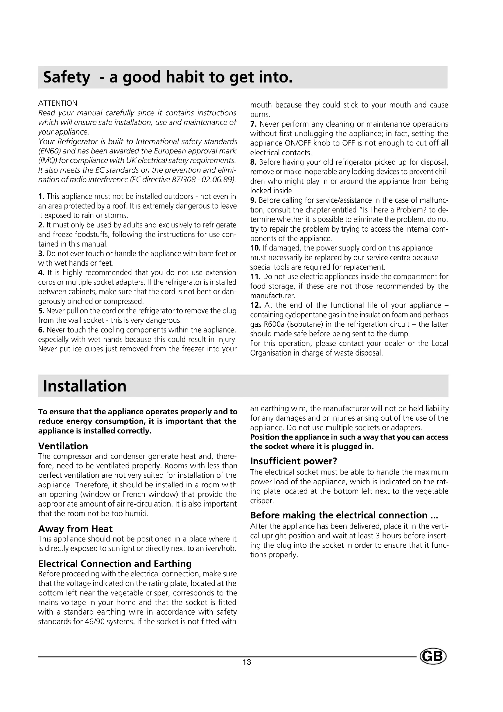 containing cyclopentane gas in the insulation foam and perhaps gas R600a (isobutane) in the refrigeration circuit – the latter should made safe before being sent to the dump. For this operation, please contact your dealer or the Local Organisation in charge of waste disposal. ATTENTION Read your manual carefully since it contains instructions which will ensure safe installation, use and maintenance of your appliance. Your Refrigerator is built to International safety standards (EN60) and has been awarded the European approval mark (IMQ) for compliance with UK electrical safety requirements. It also meets the EC standards on the prevention and elimi- nation of radio interference (EC directive 87/308 - 02.06.89).