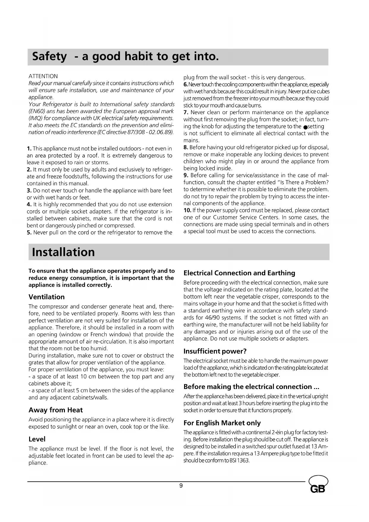 one of our Customer Service Centers. In some cases, the connections are made using special terminals and in others a special tool must be used to access the connections. Installation To ensure that the appliance operates properly and to reduce energy consumption, it is important that the appliance is installed correctly. Ventilation The compressor and condenser generate heat and, there- fore, need to be ventilated properly. Rooms with less than perfect ventilation are not very suited for installation of the appliance. Therefore, it should be installed in a room with an opening (window or French window) that provide the appropriate amount of air re-circulation. It is also important that the room not be too humid. During installation, make sure not to cover or obstruct the grates that allow for proper ventilation of the appliance. For proper ventilation of the appliance, you must leave: - a space of at least 10 cm between the top part and any cabinets above it; - a space of at least 5 cm between the sides of the appliance and any adjacent cabinets/walls. Away from Heat Avoid positioning the appliance in a place where it is directly exposed to sunlight or near an oven, cook top or the like. Level The appliance must be level. If the floor is not level, the adjustable feet located in front can be used to level the ap- pliance. Electrical Connection and Earthing Before proceeding with the electrical connection, make sure that the voltage indicated on the rating plate, located at the bottom left near the vegetable crisper, corresponds to the mains voltage in your home and that the socket is fitted with a standard earthing wire in accordance with safety stand- ards for 46/90 systems. If the socket is not fitted with an earthing wire, the manufacturer will not be held liability for any damages and or injuries arising out of the use of the appliance. Do not use multiple sockets or adapters. Insufficient power? The electrical socket must be able to handle the maximum power load of the appliance, which is indicated on the rating plate located at the bottom left next to the vegetable crisper. Before making the electrical connection ... After the appliance has been delivered, place it in the vertical upright position and wait at least 3 hours before inserting the plug into the socket in order to ensure that it functions properly. For English Market only The appliance is fitted with a continental 2-èin plug for factory test- ing. Before installation the plug should be cut off. The appliance is designed to be installed in a switched spur outlet fused at 13 Am- pere. If the installation requires a 13 Ampere plug type to be fitted it should be conform to BSI 1363. ATTENTION Read your manual carefully since it contains instructions which will ensure safe installation, use and maintenance of your appliance. Your Refrigerator is built to International safety standards (EN60) ans has been awarded the European approval mark (IMQ) for compliance with UK electrical safety requirements. It also meets the EC standards on the prevention and elimi- nation of readio interference (EC directive 87/308 - 02.06.89). Safety - a good habit to get into.