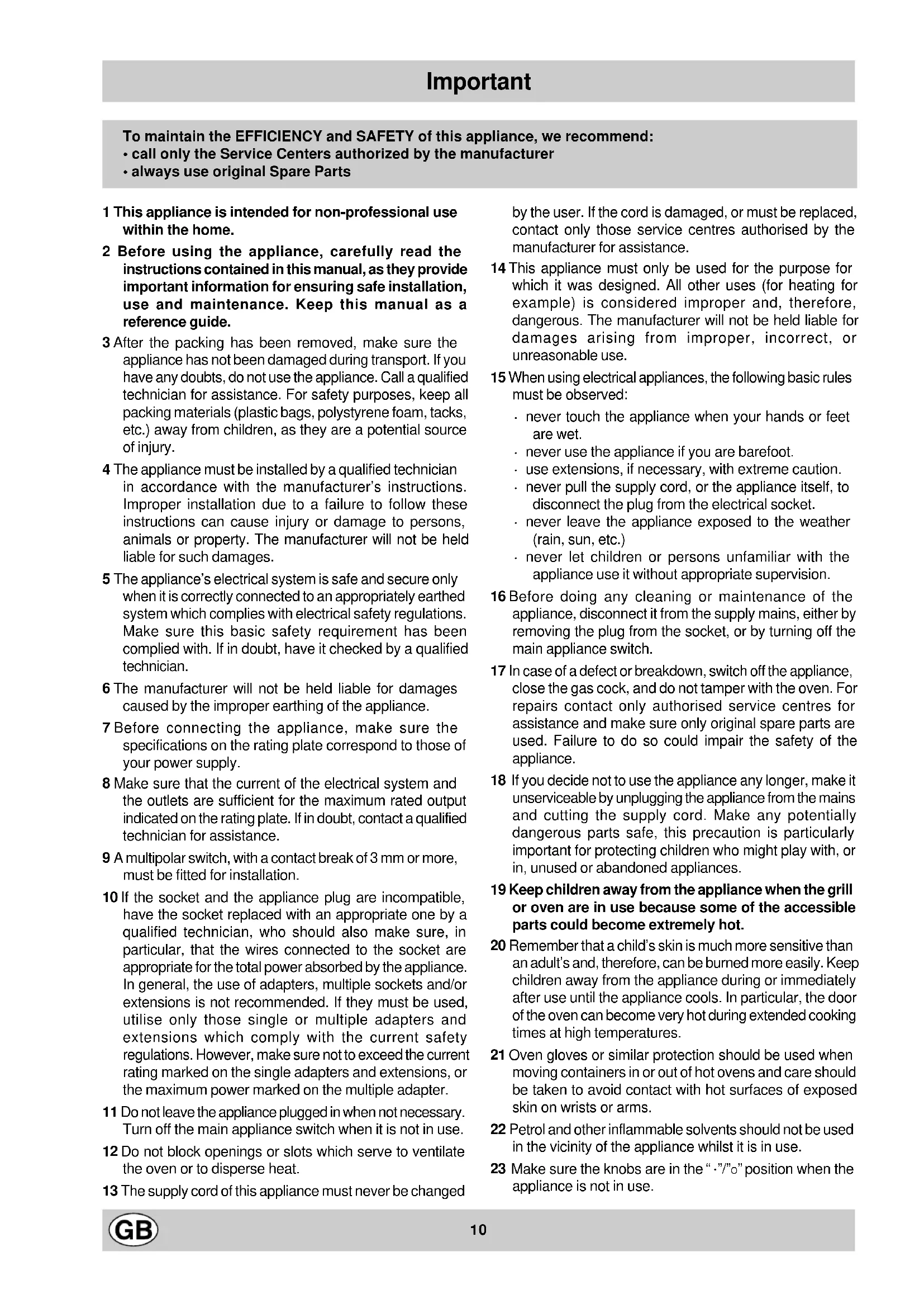 - never let children or persons unfamiliar with the appliance use it without appropriate supervision. 16 Before doing any cleaning or maintenance of the appliance, disconnect it from the supply mains, either by removing the plug from the socket, or by turning off the main appliance switch. 17 In case of a defect or breakdown, switch off the appliance, close the gas cock, and do not tamper with the oven. For repairs contact only authorised service centres for assistance and make sure only original spare parts are used. Failure to do so could impair the safety of the appliance. 18 If you decide not to use the appliance any longer, make it unserviceable by unplugging the appliance from the mains and cutting the supply cord. Make any potentially dangerous parts safe, this precaution is particularly important for protecting children who might play with, or in, unused or abandoned appliances. 19 Keep children away from the appliance when the grill or oven are in use because some of the accessible parts could become extremely hot. 20 Remember that a child’s skin is much more sensitive than an adult’s and, therefore, can be burned more easily. Keep children away from the appliance during or immediately after use until the appliance cools. In particular, the door of the oven can become very hot during extended cooking times at high temperatures. 21 Oven gloves or similar protection should be used when moving containers in or out of hot ovens and care should be taken to avoid contact with hot surfaces of exposed skin on wrists or arms. 22 Petrol and other inflammable solvents should not be used in the vicinity of the appliance whilst it is in use. 23 Make sure the knobs are in the “·”/”O” position when the appliance is not in use. Important To maintain the EFFICIENCY and SAFETY of this appliance, we recommend: