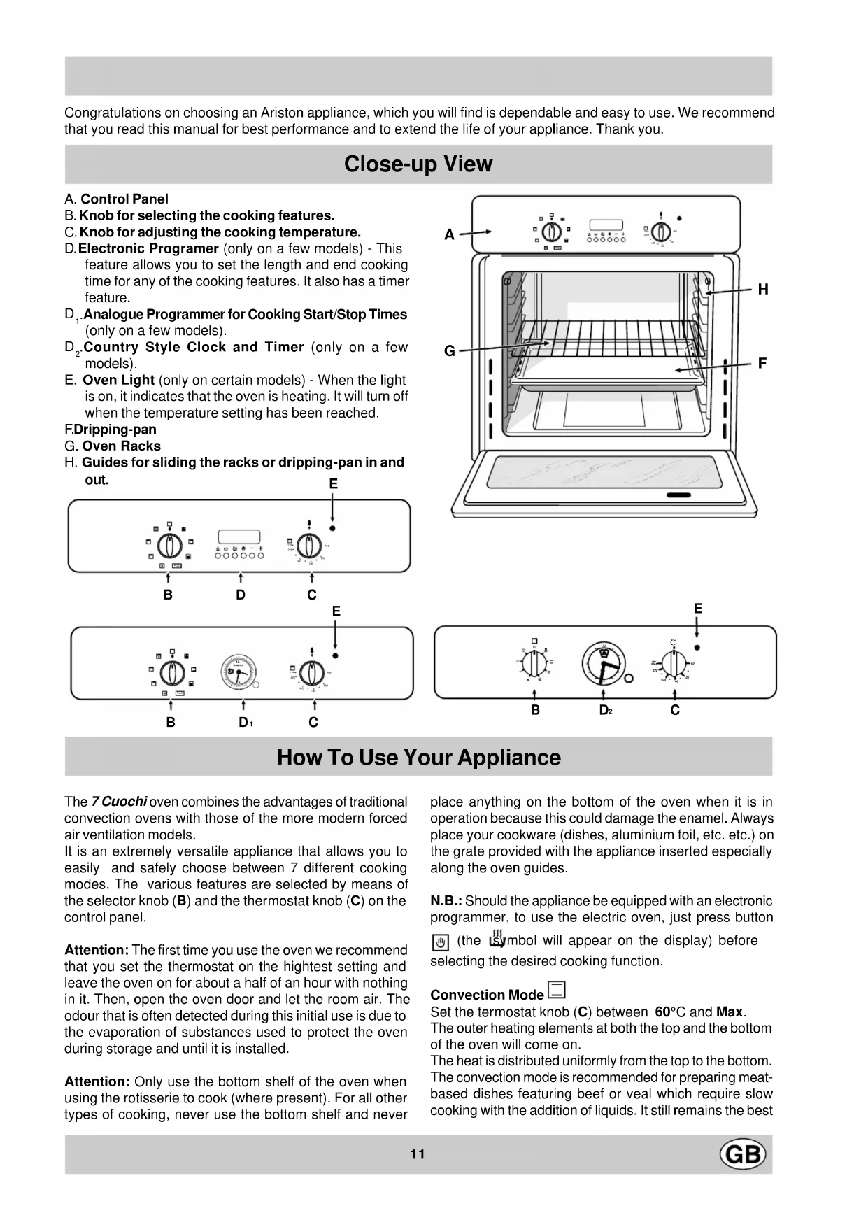 .Country Style Clock and Timer (only on a fewmodels).E. Oven Light (only on certain models) - When the lightis on, it indicates that the oven is heating. It will turn offwhen the temperature setting has been reached.F. Dripping-panG. Oven RacksH. Guides for sliding the racks or dripping-pan in and out. How To Use Your Appliance The 7 Cuochi oven combines the advantages of traditionalconvection ovens with those of the more modern forcedair ventilation models.It is an extremely versatile appliance that allows you toeasily and safely choose between 7 different cookingmodes. The various features are selected by means of the selector knob (B) and the thermostat knob (C) on the control panel.Attention: The first time you use the oven we recommendthat you set the thermostat on the hightest setting andleave the oven on for about a half of an hour with nothingin it. Then, open the oven door and let the room air. Theodour that is often detected during this initial use is due tothe evaporation of substances used to protect the ovenduring storage and until it is installed.Attention: Only use the bottom shelf of the oven whenusing the rotisserie to cook (where present). For all othertypes of cooking, never use the bottom shelf and neverplace anything on the bottom of the oven when it is inoperation because this could damage the enamel. Alwaysplace your cookware (dishes, aluminium foil, etc. etc.) onthe grate provided with the appliance inserted especiallyalong the oven guides.N.B.: Should the appliance be equipped with an electronicprogrammer, to use the electric oven, just press button (the symbol will appear on the display) beforeselecting the desired cooking function.Convection Mode Set the termostat knob (C) between 60°C and Max. The outer heating elements at both the top and the bottomof the oven will come on.The heat is distributed uniformly from the top to the bottom.The convection mode is recommended for preparing meat-based dishes featuring beef or veal which require slowcooking with the addition of liquids. It still remains the best