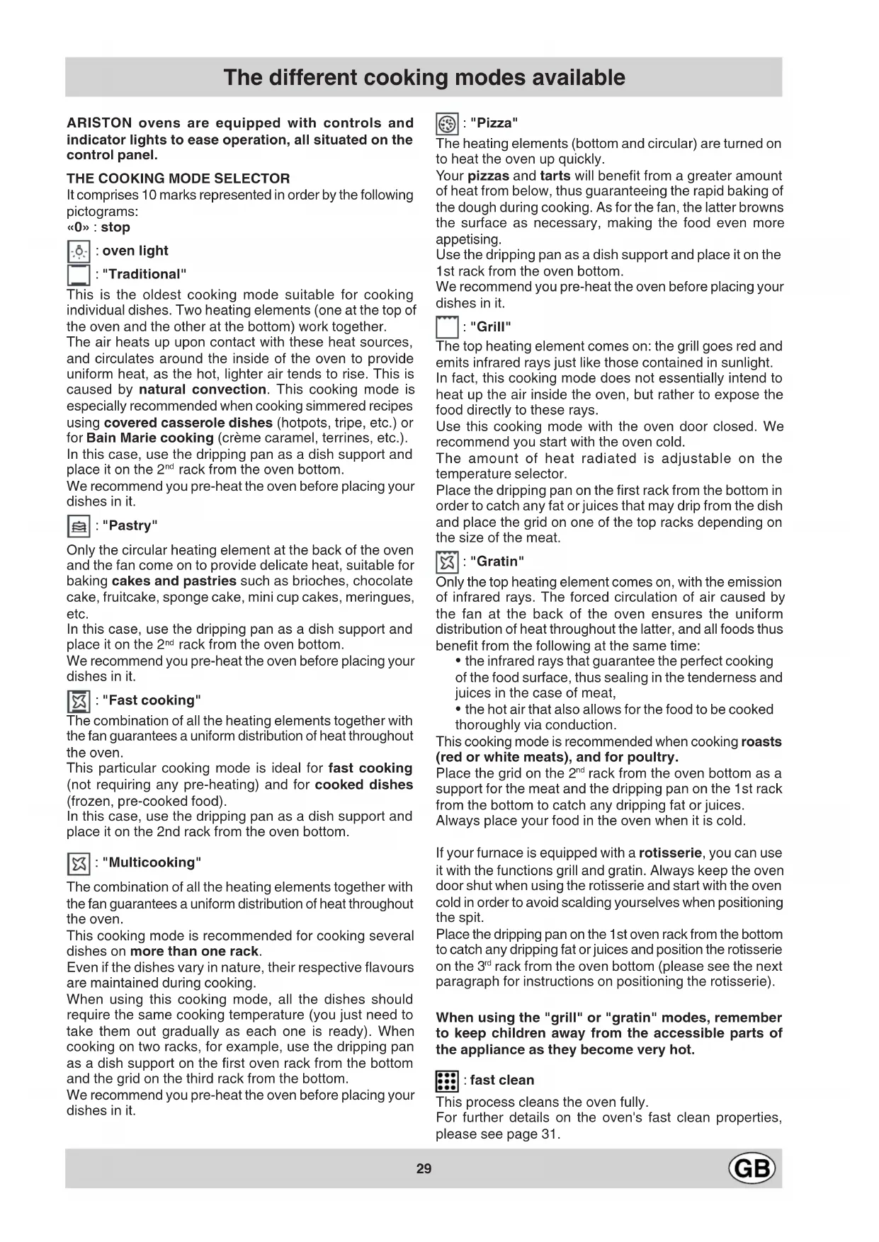 - a removable handle made of insulating material to screw onto the front of the spit allows you: - to have a rotisserie which is long enough for even the largest of roasts - to avoid scalding yourself when removing the roast at the end of cooking. Screw on the handle tightly to take out the spit (the handle should be removed from the spit during cooking). Rotisserie timer ARISTON ovens are fitted with a rotisserie timing device. When cooking is done, the rotisserie motor continues to turn the spit and only comes to a stop when the temperature inside the oven has dropped sufficiently: this prevents the surface of the meat from burning. When cooking is done, leave the mode selector set to the cooking mode under way and set the temperature selector back to the minimum setting. Continued ventilation The fan stays on when cooking is done in order to cool the oven down. So do not worry if you hear the fan going even after you have turned the oven off: the ventilation will come to a stop when the temperature has dropped below 120°. Oven light To turn the oven light on, set the mode selector knob to the symbol. The oven light stays on during cooking, whatever the cooking mode (with the exception of the self-cleaning mode). If you decide to delay the cooking start, the oven light comes on as soon as you programme the start and stays on until cooking is done.31 Fast clean How to set the cleaning process in motion – Take all the accessories out of the oven. Remove the toughest grease and food spots and especially all substantial overflows in order to avoid the creation of flames or smoke. – Shut the oven door. – Set the mode selector to – Programme it. You can choose between