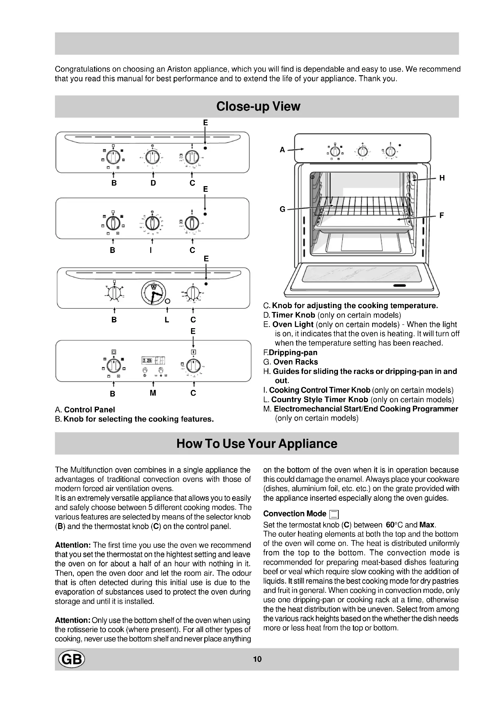 A. Control Panel B. Knob for selecting the cooking features. The Multifunction oven combines in a single appliance the advantages of traditional convection ovens with those of modern forced air ventilation ovens. It is an extremely versatile appliance that allows you to easily and safely choose between 5 different cooking modes. The various features are selected by means of the selector knob (B) and the thermostat knob (C) on the control panel. Attention: The first time you use the oven we recommend that you set the thermostat on the hightest setting and leave the oven on for about a half of an hour with nothing in it. Then, open the oven door and let the room air. The odour that is often detected during this initial use is due to the evaporation of substances used to protect the oven during storage and until it is installed. Attention: Only use the bottom shelf of the oven when using the rotisserie to cook (where present). For all other types of cooking, never use the bottom shelf and never place anything on the bottom of the oven when it is in operation because this could damage the enamel. Always place your cookware (dishes, aluminium foil, etc. etc.) on the grate provided with the appliance inserted especially along the oven guides. Convection Mode Set the termostat knob (C) between 60°C and Max. The outer heating elements at both the top and the bottom of the oven will come on. The heat is distributed uniformly from the top to the bottom. The convection mode is recommended for preparing meat-based dishes featuring beef or veal which require slow cooking with the addition of liquids. It still remains the best cooking mode for dry pastries and fruit in general. When cooking in convection mode, only use one dripping-pan or cooking rack at a time, otherwise the the heat distribution with be uneven. Select from among the various rack heights based on the whether the dish needs more or less heat from the top or bottom. How To Use Your Appliance