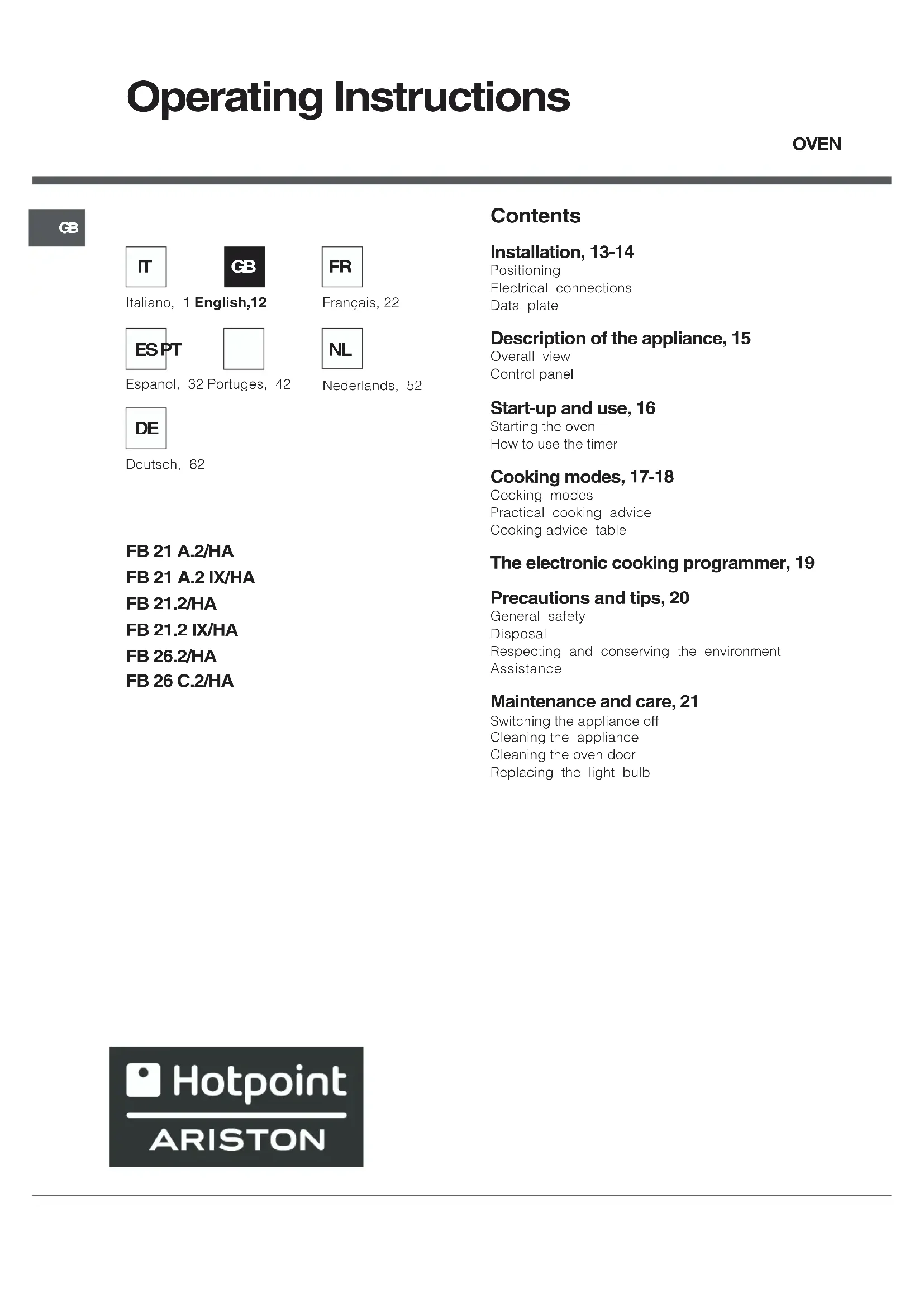 Download the instructions for your Oven in PDF format for free! Find your manual FB 21.2 - Ariston Thermo and take your electronic device back in hand. On this page are published all the documents necessary for the use of your device. FB 21.2 by Ariston Thermo.