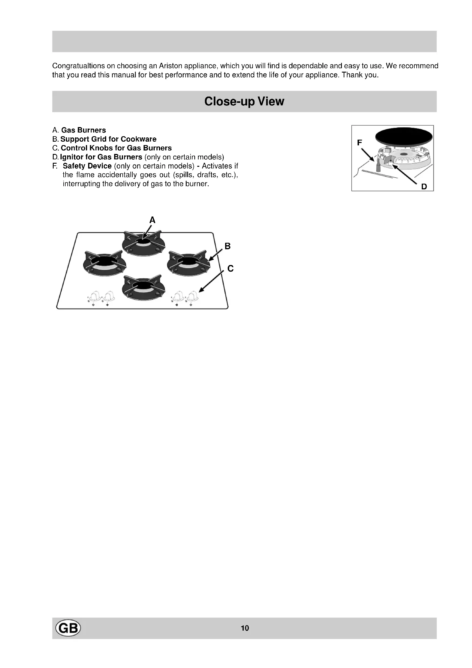 SR10 A. Gas Burners B. Support Grid for Cookware C. Control Knobs for Gas Burners D. Ignitor for Gas Burners (only on certain models) F. Safety Device (only on certain models) - Activates if the flame accidentally goes out (spills, drafts, etc.), interrupting the delivery of gas to the burner. Close-up View Congratualtions on choosing an Ariston appliance, which you will find is dependable and easy to use. We recommend that you read this manual for best performance and to extend the life of your appliance. Thank you.