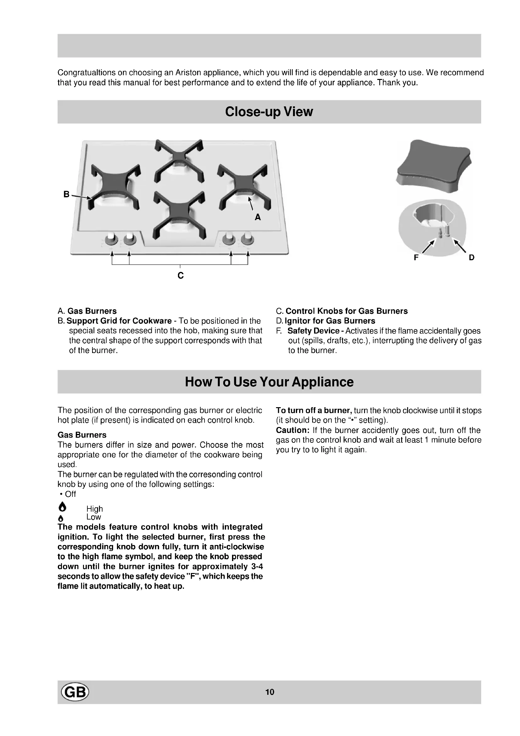- Off High Low The models feature control knobs with integrated ignition. To light the selected burner, first press the corresponding knob down fully, turn it anti-clockwise to the high flame symbol, and keep the knob pressed down until the burner ignites for approximately 3-4 seconds to allow the safety device "F", which keeps the flame lit automatically, to heat up. To turn off a burner, turn the knob clockwise until it stops (it should be on the “•” setting). Caution: If the burner accidently goes out, turn off the gas on the control knob and wait at least 1 minute before you try to to light it again. Congratualtions on choosing an Ariston appliance, which you will find is dependable and easy to use. We recommend that you read this manual for best performance and to extend the life of your appliance. Thank you.