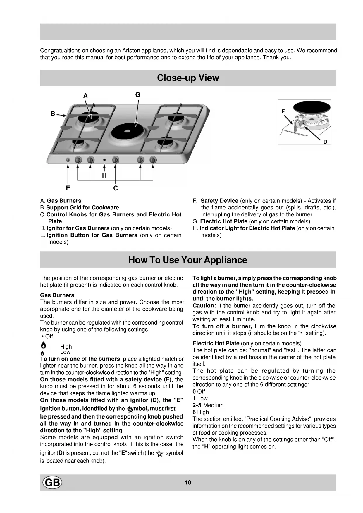 - Off High Low To turn on one of the burners, place a lighted match or lighter near the burner, press the knob all the way in and turn in the counter-clockwise direction to the "High" setting. On those models fitted with a safety device (F), the knob must be pressed in for about 6 seconds until the device that keeps the flame lighted warms up. On those models fitted with an ignitor (D), the "E" ignition button, identified by the symbol, must first be pressed and then the corresponding knob pushed all the way in and turned in the counter-clockwise direction to the "High" setting. Some models are equipped with an ignition switch incorporated into the control knob. If this is the case, the ignitor (D) is present, but not the "E" switch (the symbol is located near each knob). To light a burner, simply press the corresponding knob all the way in and then turn it in the counter-clockwise direction to the "High" setting, keeping it pressed in until the burner lights. Caution: If the burner accidently goes out, turn off the gas with the control knob and try to light it again after waiting at least 1 minute. To turn off a burner, turn the knob in the clockwise direction until it stops (it should be on the “•” setting). Electric Hot Plate (only on certain models) The hot plate can be: "normal" and "fast". The latter can be identified by a red boss in the center of the hot plate itself. The hot plate can be regulated by turning the corresponding knob in the clockwise or counter-clockwise direction to any one of the 6 different settings: 0 Off 1 Low 2-5 Medium 6 High The section entitled, "Practical Cooking Advise", provides information on the recommended settings for various types of food or cooking processes. When the knob is on any of the settings other than "Off", the "H" operating light comes on. Congratualtions on choosing an Ariston appliance, which you will find is dependable and easy to use. We recommend that you read this manual for best performance and to extend the life of your appliance. Thank you.