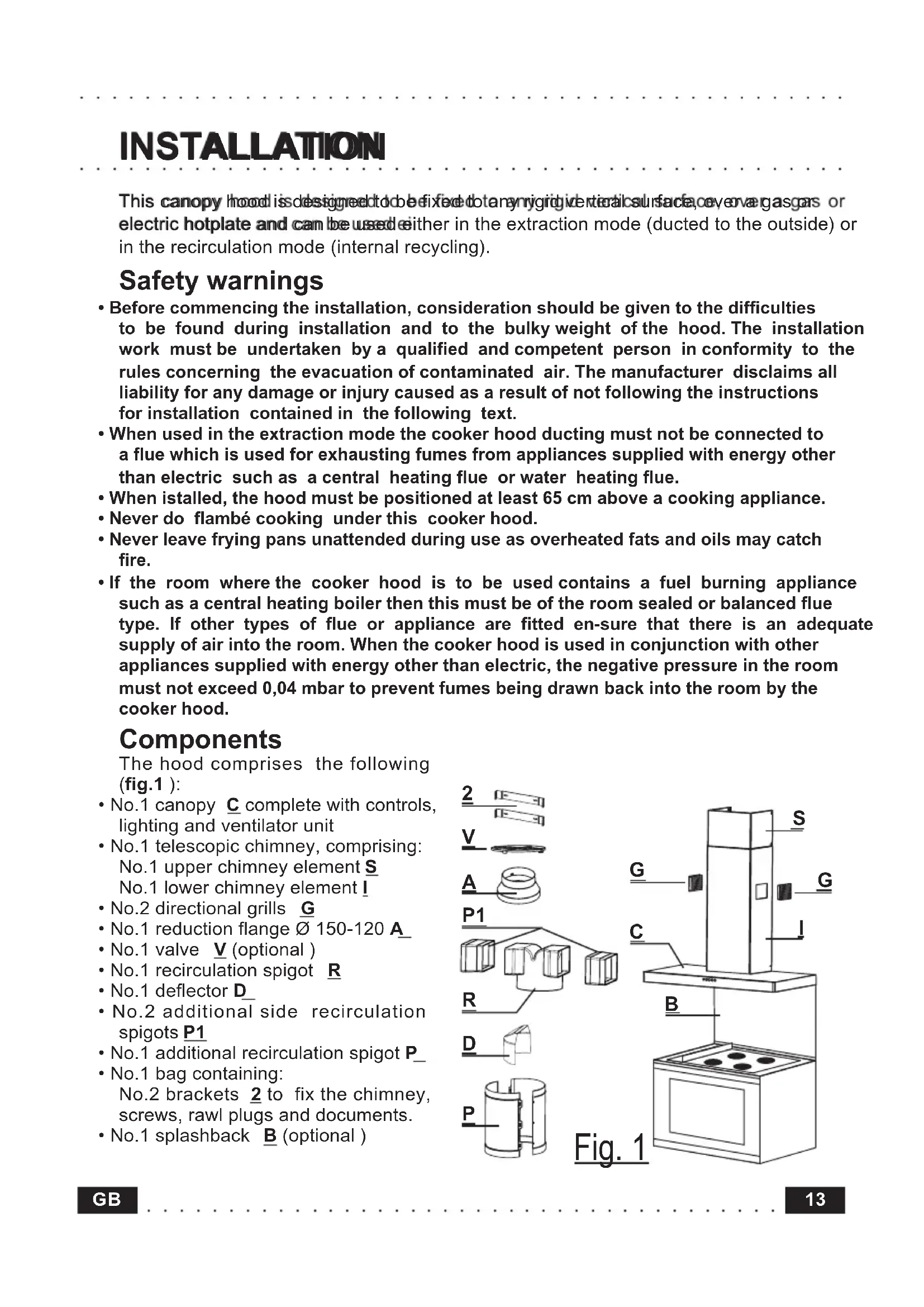 - If the room where the cooker hood is to be used contains a fuel burning appliance such as a central heating boiler then this must be of the room sealed or balanced flue type. If other types of flue or appliance are fitted en-sure that there is an adequate supply of air into the room. When the cooker hood is used in conjunction with other appliances supplied with energy other than electric, the negative pressure in the room must not exceed 0,04 mbar to prevent fumes being drawn back into the room by the cooker hood. Components The hood comprises the following (fig.1 ):