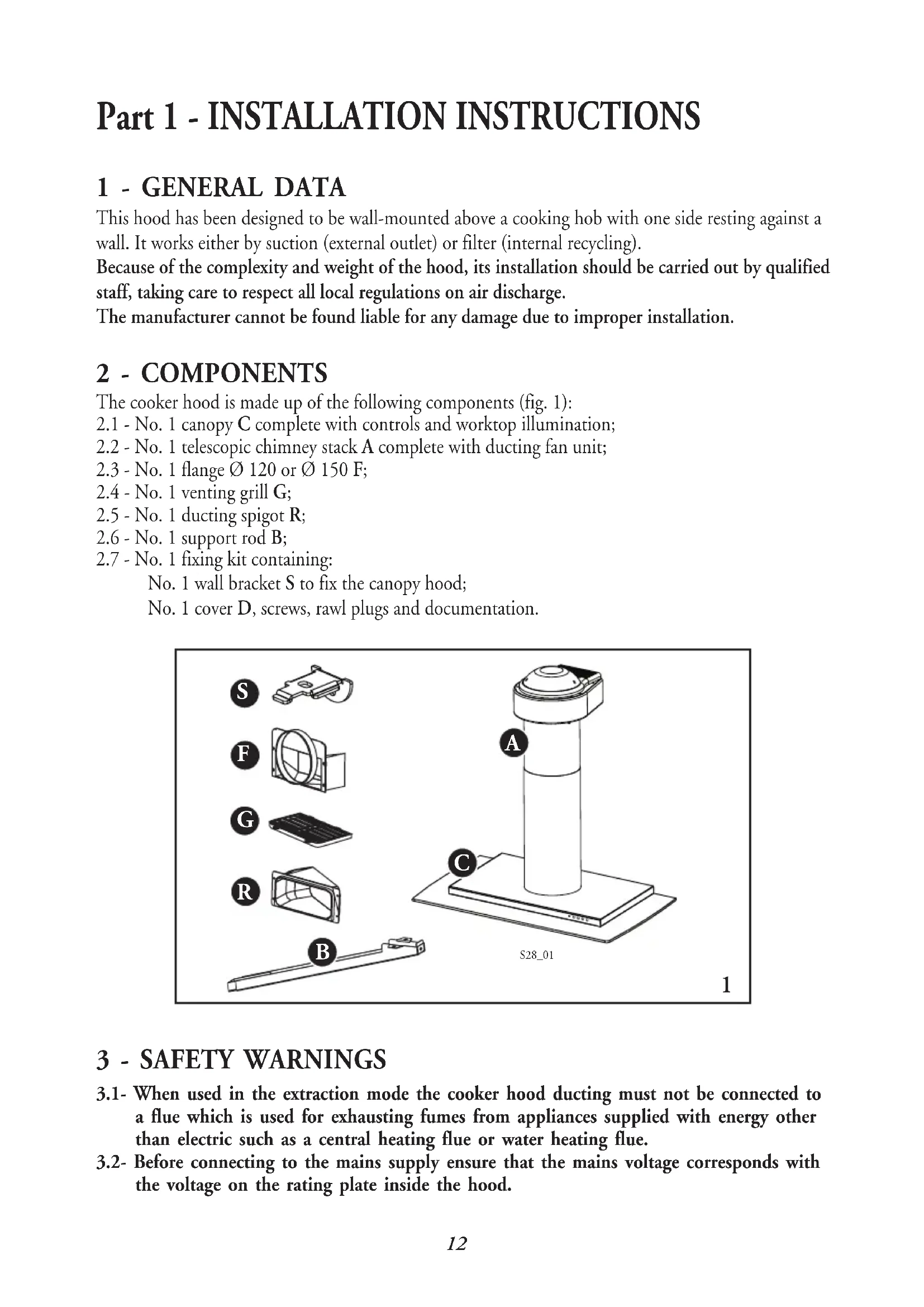 3.1- When used in the extraction mode the cooker hood ducting must not be connected to a flue which is used for exhausting fumes from appliances supplied with energy other than electric such as a central heating flue or water heating flue. 3.2- Before connecting to the mains supply ensure that the mains voltage corresponds with the voltage on the rating plate inside the hood.