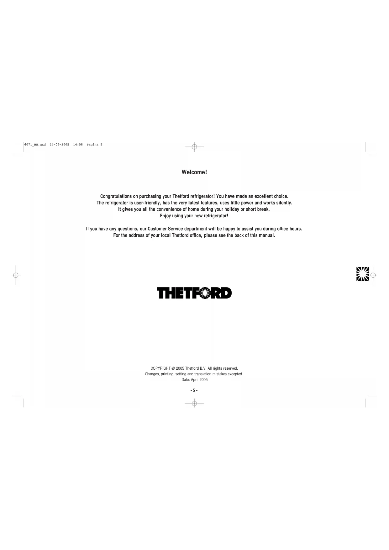 - average energy consumption at ambient temperature of 25° C TECHNICAL DATA Thetford absorber refrigerators: Category C11 AC 230V (50/60 Hz) DC 12V Gas types I3+ (G30: 28-30/G31: 37 mbar) (Countries: BE, FR, IE, LU, PT, ES, GB, GR, IT) I3B/P (G30/G31: 28-30 mbar) (Countries: DK, DE, IS, NL, SE, FI, NO) (G30 = butane, G31 = propane) 6071_C.qxd 28-06-2005 15:43 Pagina 2Welcome! Congratulations on purchasing your Thetford refrigerator! You have made an excellent choice. The refrigerator is user-friendly, has the very latest features, uses little power and works silently. It gives you all the convenience of home during your holiday or short break. Enjoy using your new refrigerator! If you have any questions, our Customer Service department will be happy to assist you during office hours. For the address of your local Thetford office, please see the back of this manual. COPYRIGHT © 2005 Thetford B.V. All rights reserved. Changes, printing, setting and translation mistakes excepted. Date: April 2005