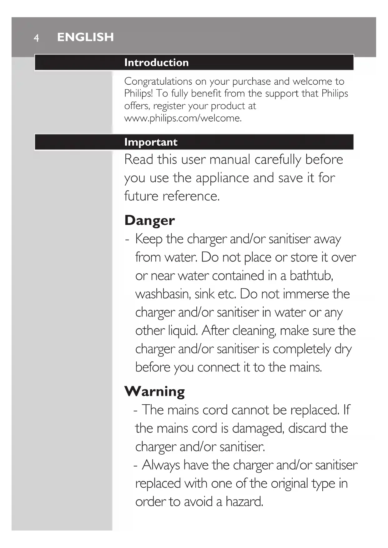 Sonicare FlexCare Platinum1Sonicare FlexCare Platinum ENGLISH 4 DEUTSCH 22 ESPAÑOL 44 FRANÇAIS 64 ITALIANO 82 NEDERLANDS 103 PORTUGUÊS 1254 Introduction Congratulations on your purchase and welcome to Philips! To fully benet from the support that Philips offers, register your product at www.philips.com/welcome. Important Read this user manual carefully before you use the appliance and save it for future reference. Danger