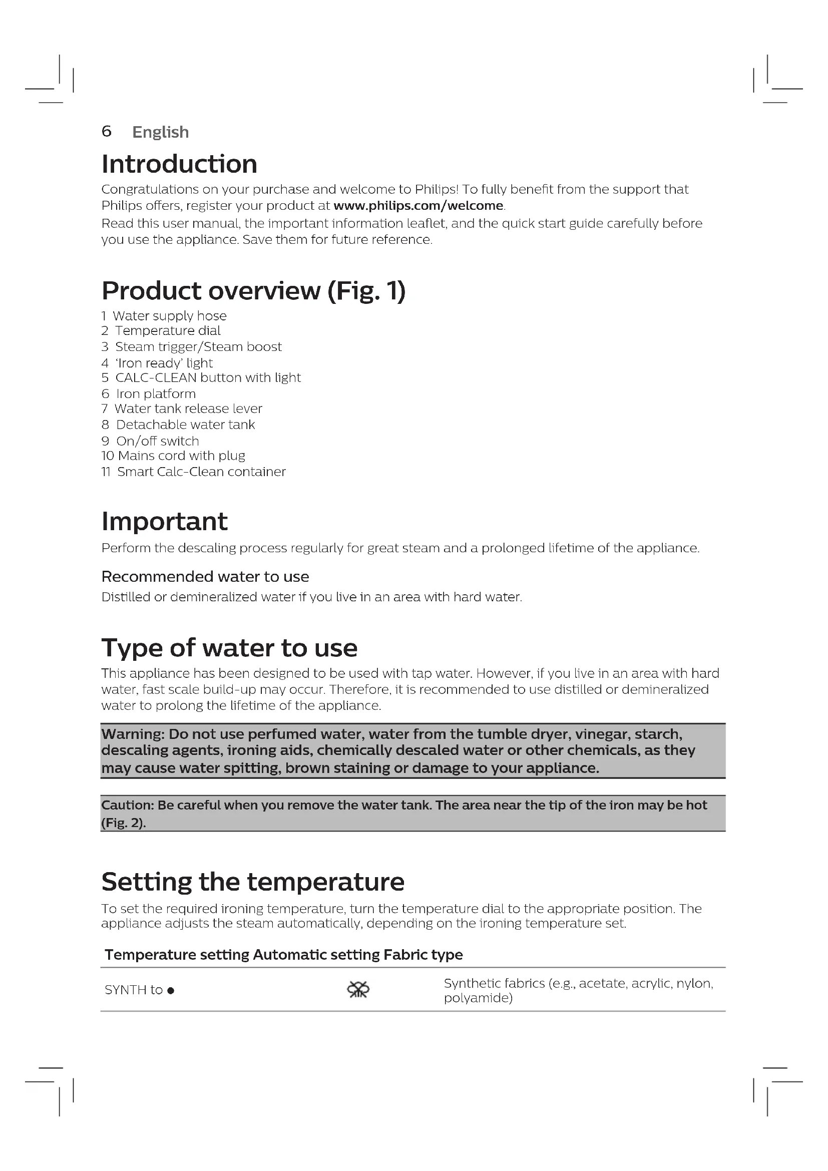descaling agents, ironing aids, chemically descaled water or other chemicals, as they may cause water spitting, brown staining or damage to your appliance. Caution: Be careful when you remove the water tank. The area near the tip of the iron may be hot (Fig. 2). Setting the temperature To set the required ironing temperature, turn the temperature dial to the appropriate position. The appliance adjusts the steam automatically, depending on the ironing temperature set. Temperature setting Automatic setting Fabric type SYNTH to 1 Synthetic fabrics (e.g., acetate, acrylic, nylon, polyamide)7 English Temperature setting Automatic setting Fabric type