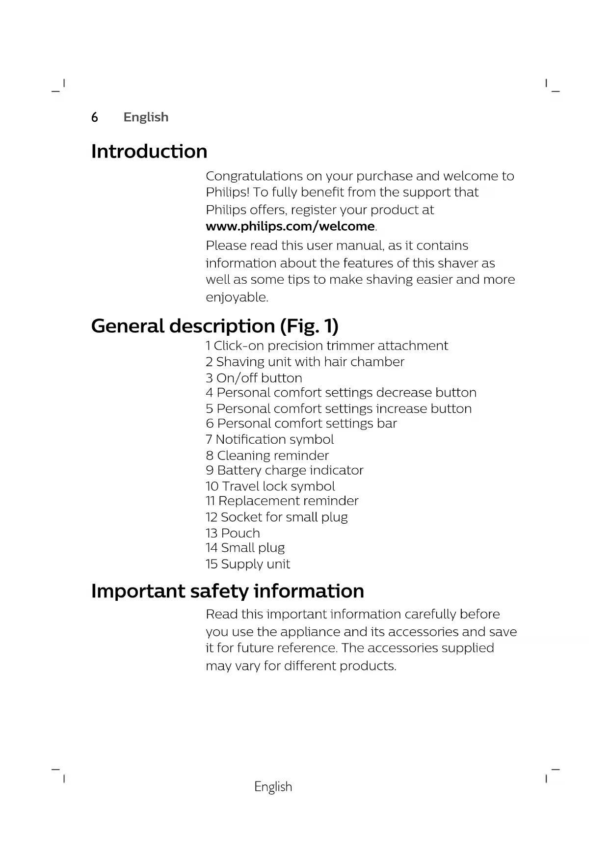 15empty page before TOCEnglish 6 Français (Canada) 27English Introduction Congratulations on your purchase and welcome to Philips! To fully benefit from the support that Philips offers, register your product at www.philips.com/welcome. Please read this user manual, as it contains information about the features of this shaver as well as some tips to make shaving easier and more enjoyable. General description (Fig. 1) 1 Click-on precision trimmer attachment 2 Shaving unit with hair chamber 3 On/off button 4 Personal comfort settings decrease button 5 Personal comfort settings increase button 6 Personal comfort settings bar 7 Notification symbol 8 Cleaning reminder 9 Battery charge indicator 10 Travel lock symbol 11 Replacement reminder 12 Socket for small plug 13 Pouch 14 Small plug 15 Supply unit Important safety information Read this important information carefully before you use the appliance and its accessories and save it for future reference. The accessories supplied may vary for different products.
