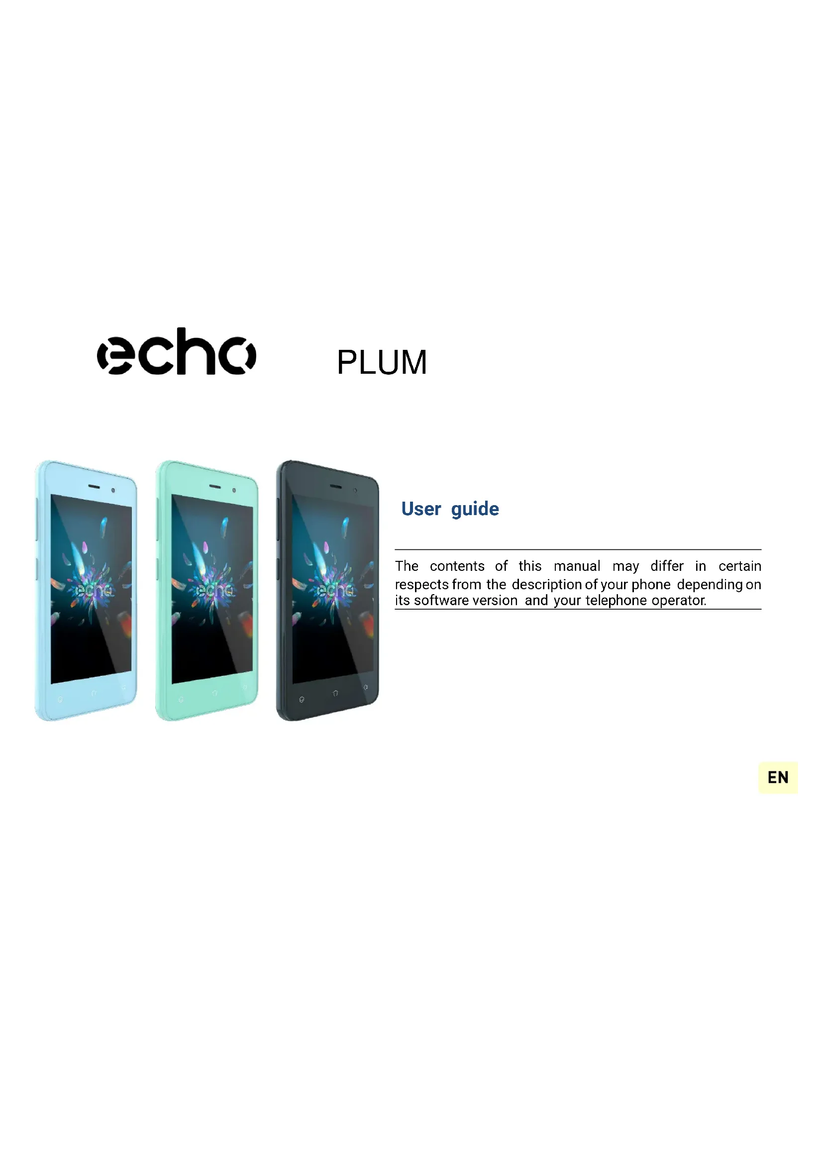 Le texte intégral de la déclaration de conformité de l’appareil est disponible en ligne : https://www.echomobiles.com/assistance/ A pleine puissance, l’écoute prolongée du baladeur peut endommager l’oreille de l’utilisateur.User guide PLUM The contents of this manual may differ in certain respects from the description of your phone depending on its software version and your telephone operator.CONGRATULATIONS! You have just purchased your Echo PLUM mobile phone. This guide contains all the information needed to use the phone so that you can quickly familiarize yourself, we hope, with the world of Echo. contained herein do not constitute a guarantee under the Applicable law. ECHO reserves the right to change or modify the information contained in this manual at any time. Copyright © 2017 ECHO The information contained in this manual may not be disclosed to third parties or reproduced in any form whatsoever without the express written consent of ECHO. ECHO is a registered trademark of Modelabs Mobiles SAS. Limitation of Liability All content and services accessible through this device are the exclusive property of third parties and are protected by the relevant laws (copyright, patent, licence and/or other intellectual property laws). These services are for your own personal non- commercial use. It is not permitted to use any content or services without prior written permission of the content owner. You may not copy, publish, transfer, sell, create derivative works or exploit in any manner or medium any content or services displayed through this device. Disclaimer This manual has been prepared with the utmost care and attention and is designed to guide you through the functions and features of your device. However, the information and recommandationsTHIRD PARTY CONTENT AND SERVICES ARE PROVIDED “AS IS.” ECHO DOES NOT GUARANTEE THE CONTENT OR SERVICES SO PROVIDED, EITHER