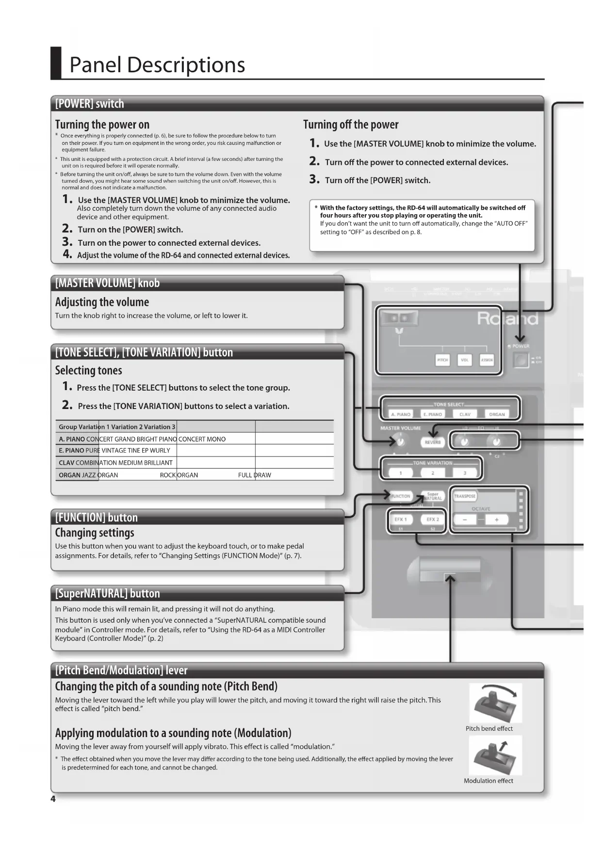 - With the factory settings, the RD-64 will automatically be switched o four hours after you stop playing or operating the unit. If you don’t want the unit to turn o automatically, change the “AUTO OFF” setting to “OFF” as described on p. 8.Panel Descriptions
