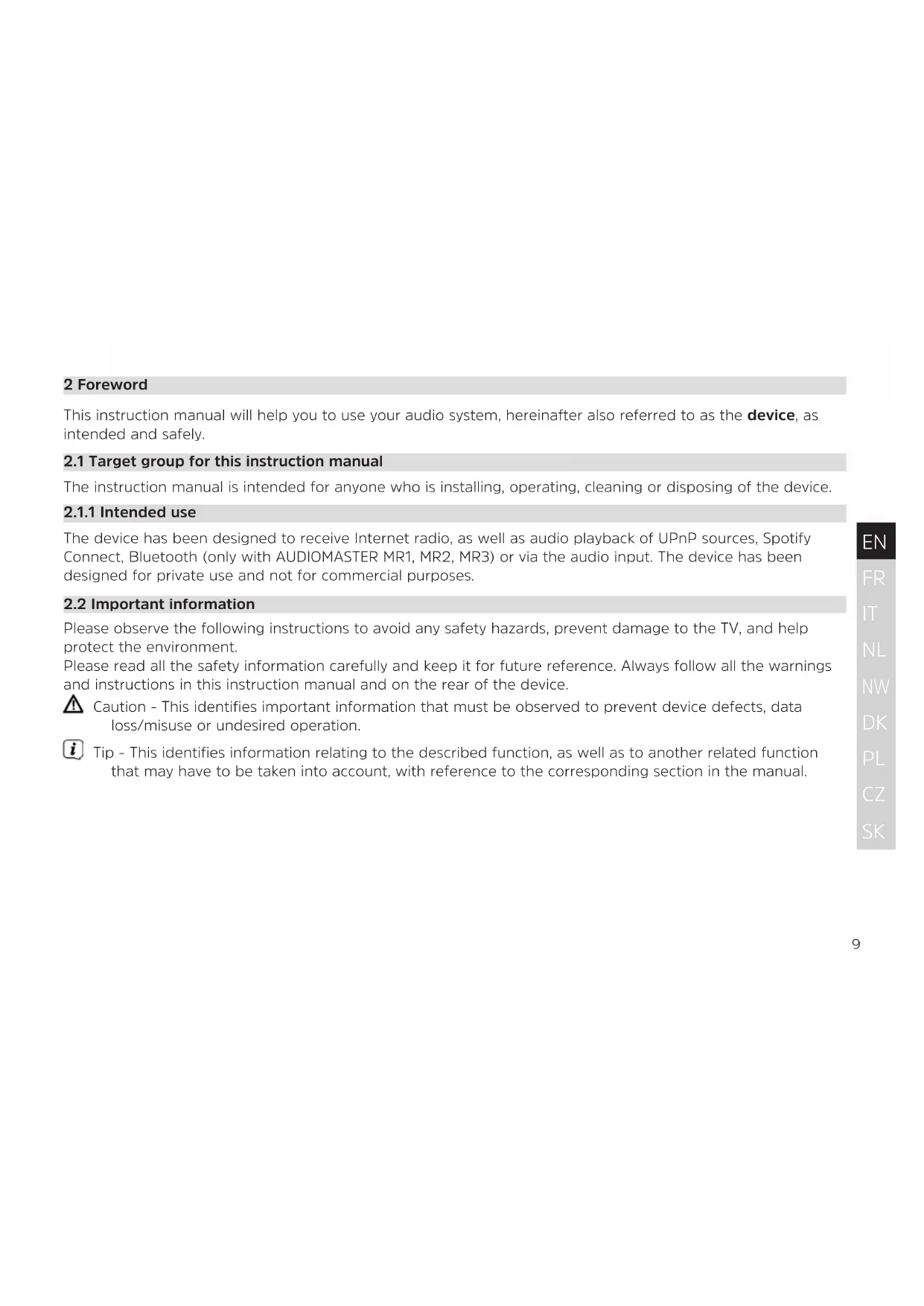 The device has been designed to receive Internet radio, as well as audio playback of UPnP sources, Spotify Connect, Bluetooth (only with AUDIOMASTER MR1, MR2, MR3) or via the audio input. The device has been designed for private use and not for commercial purposes.