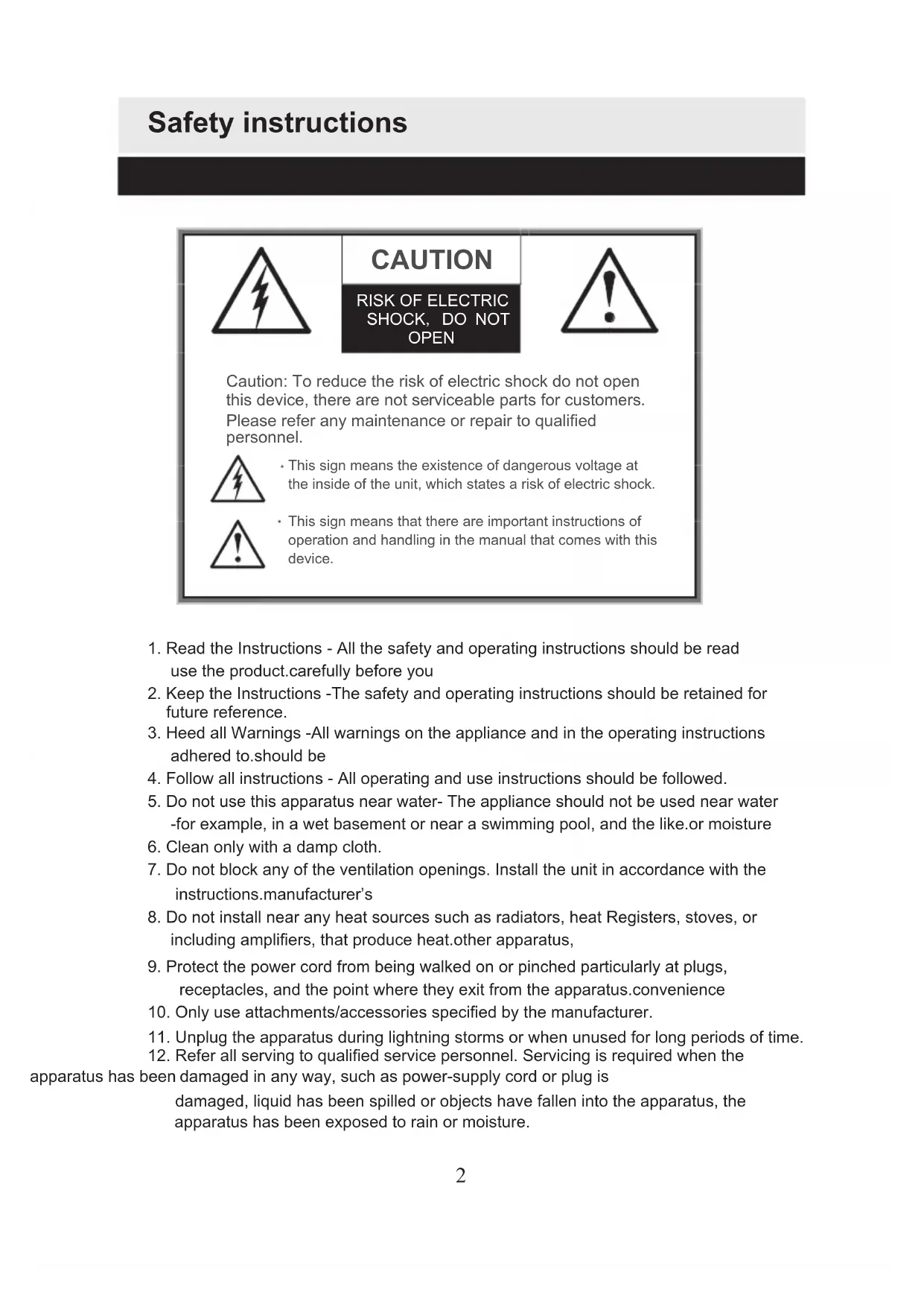 damaged in any way, such as power-supply cord or plug is apparatus has been objects have fallen into the apparatus, the damaged, liquid has been spilled or apparatus has been exposed to rain or moisture. 2Safety instructions