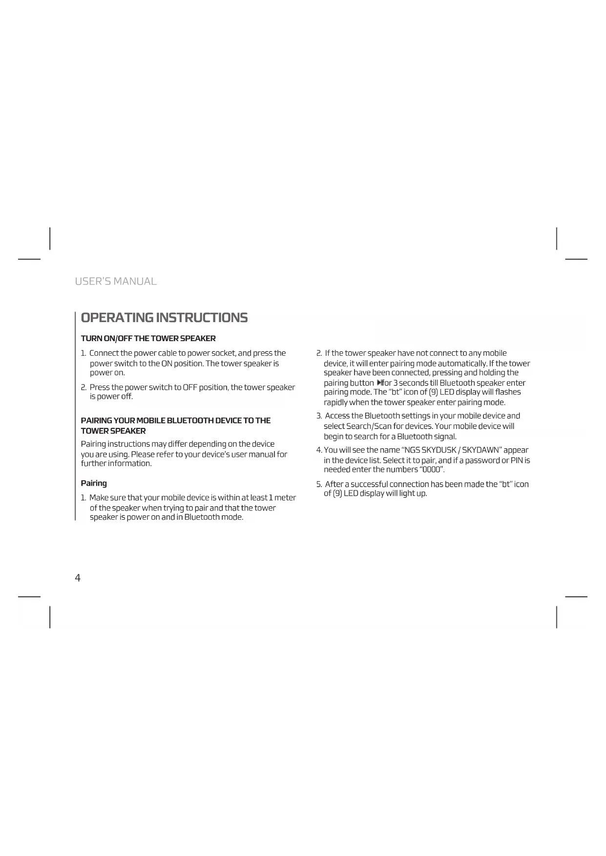 is power off. PAIRING YOUR MOBILE BLUETOOTH DEVICE TO THE TOWER SPEAKER Pairing instructions may differ depending on the device you are using. Please refer to your device’s user manual for further information. Pairing