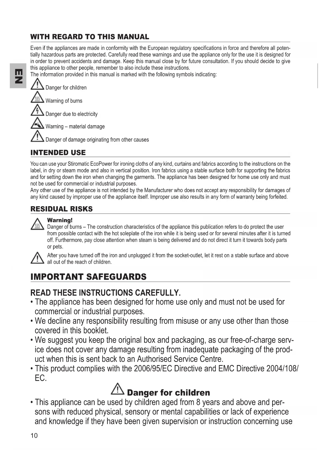 Even if the appliances are made in conformity with the European regulatory specications in force and therefore all poten- tially hazardous parts are protected. Carefully read these warnings and use the appliance only for the use it is designed for in order to prevent accidents and damage. Keep this manual close by for future consultation. If you should decide to give this appliance to other people, remember to also include these instructions. The information provided in this manual is marked with the following symbols indicating: Danger for children Warning of burns Danger due to electricity Warning – material damage Danger of damage originating from other causes INTENDED USE You can use your Stiromatic EcoPower for ironing cloths of any kind, curtains and fabrics according to the instructions on the label, in dry or steam mode and also in vertical position. Iron fabrics using a stable surface both for supporting the fabrics and for setting down the iron when changing the garments. The appliance has been designed for home use only and must not be used for commercial or industrial purposes. Any other use of the appliance is not intended by the Manufacturer who does not accept any responsibility for damages of any kind caused by improper use of the appliance itself. Improper use also results in any form of warranty being forfeited. RESIDUAL RISKS Warning! Danger of burns – The construction characteristics of the appliance this publication refers to do protect the user from possible contact with the hot soleplate of the iron while it is being used or for several minutes after it is turned off. Furthermore, pay close attention when steam is being delivered and do not direct it turn it towards body parts or pets. After you have turned off the iron and unplugged it from the socket-outlet, let it rest on a stable surface and above all out of the reach of children. IMPORTANT SAFEGUARDS READ THESE INSTRUCTIONS CAREFULLY.