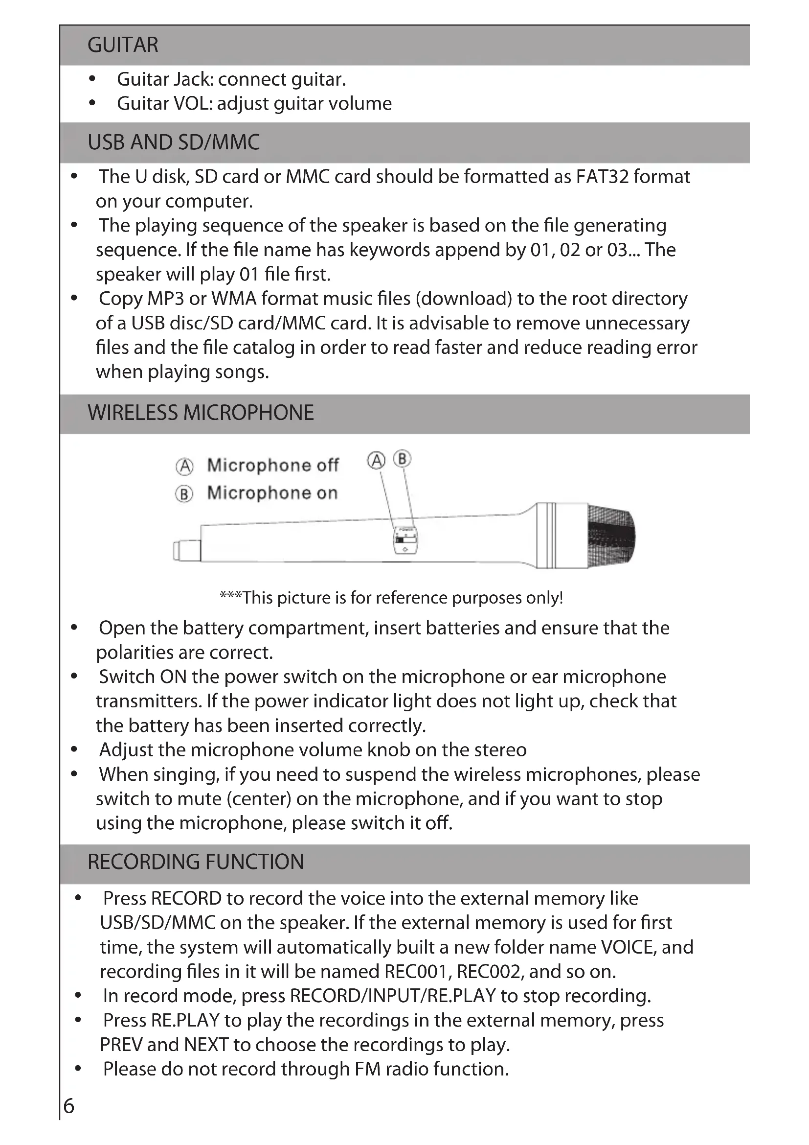 Ÿ The U disk, SD card or MMC card should be formatted as FAT32 format on your computer. Ÿ The playing sequence of the speaker is based on the le generating sequence. If the le name has keywords append by 01, 02 or 03... The speaker will play 01 le rst. Ÿ Copy MP3 or WMA format music les (download) to the root directory of a USB disc/SD card/MMC card. It is advisable to remove unnecessary les and the le catalog in order to read faster and reduce reading error when playing songs. WIRELESS MICROPHONE ***This picture is for reference purposes only! Ÿ Open the battery compartment, insert batteries and ensure that the polarities are correct. Ÿ Switch ON the power switch on the microphone or ear microphone transmitters. If the power indicator light does not light up, check that the battery has been inserted correctly. Ÿ Adjust the microphone volume knob on the stereo Ÿ When singing, if you need to suspend the wireless microphones, please switch to mute (center) on the microphone, and if you want to stop using the microphone, please switch it off. RECORDING FUNCTION Ÿ Press RECORD to record the voice into the external memory like USB/SD/MMC on the speaker. If the external memory is used for rst time, the system will automatically built a new folder name VOICE, and recording les in it will be named REC001, REC002, and so on. Ÿ In record mode, press RECORD/INPUT/RE.PLAY to stop recording. Ÿ Press RE.PLAY to play the recordings in the external memory, press PREV and NEXT to choose the recordings to play. Ÿ Please do not record through FM radio function.