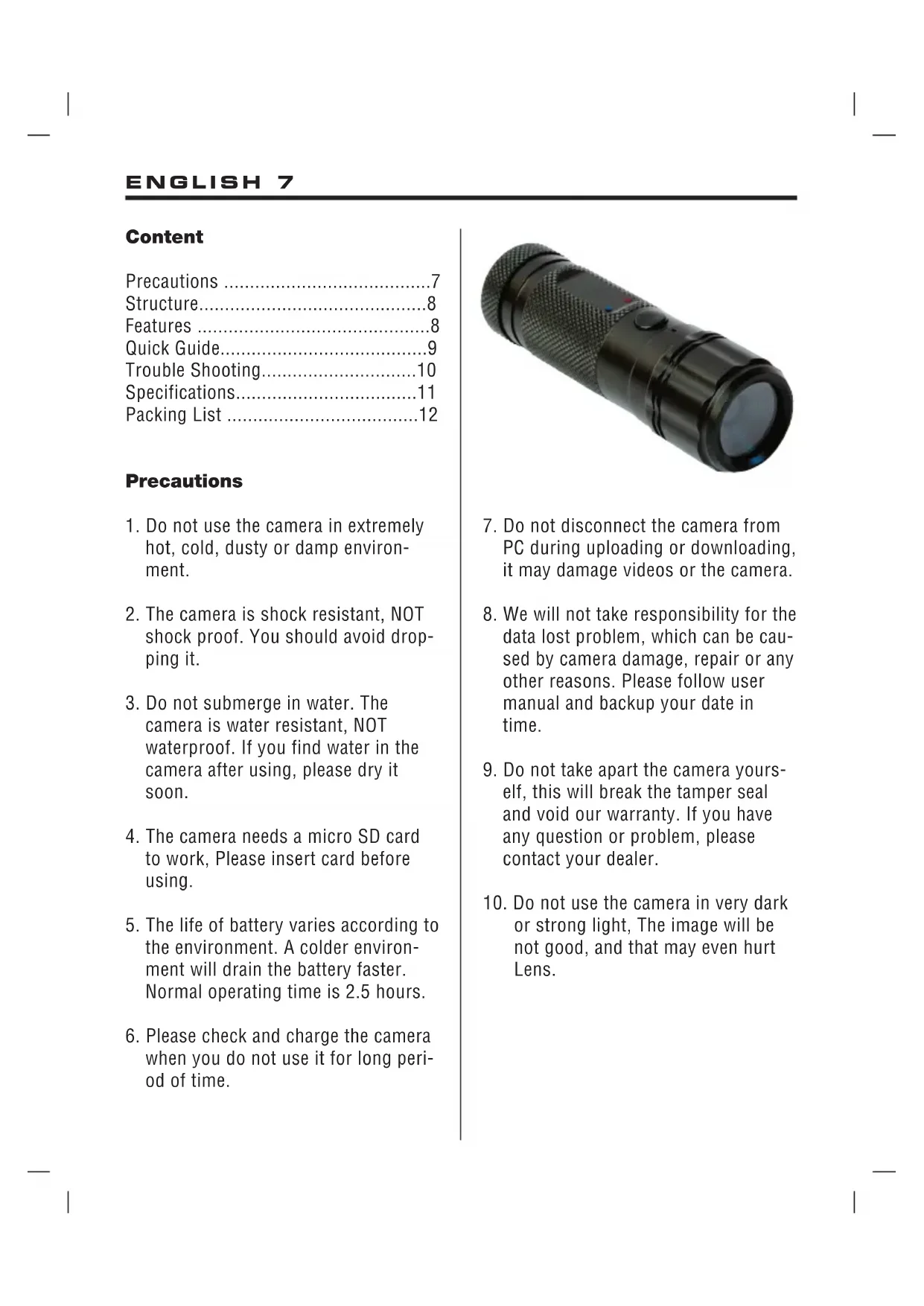 - Q4: How can I know the power is low? A4: The red indicator flashes quickly, then camera turns off automatically. Q5: No file in card after recording, how should I do? A5:Format or change the card, try to record again. According to user manual, step by step. Q6: Why the video is not clear enough? A6: Check the lens to make sure it’s cle- an. And confirm you do not shake strongly while recording. Q7:The video and audio is out of step when play on PC, why? A7: Try to play videos by other player, such as VLC Media player and Storm player. ENGLISH 10Specifications Image Sensor: CMOS View Angle: 120degrees Recording Resolution: 1280 x 720 Recording Frame: 30 FPS Video Format: AVI Video File Size: 75MB/minute Video Recording Section: 20 minutes USB Interface: USB 2.0 Memory: No flash built-in. Support micro SD card up to 32GB Battery Working Time: 2.5 hours Battery Charging Time: 3 hours Color: Black Dimension: 9.5 x 2.8 x 2.8 cm Weight: 64 grams Time stamp: Selectable Cycling Record: Selectable DEUTSCH 11ENGLISH 12 Packing list Camera Charger USB cable Head Band Velcro Arm Band User Manual Wrist Ring Waterproof case Moundt for bike Holder for car Car charger (optional) (optional)Sommaire Mesures de sécurité p. 13