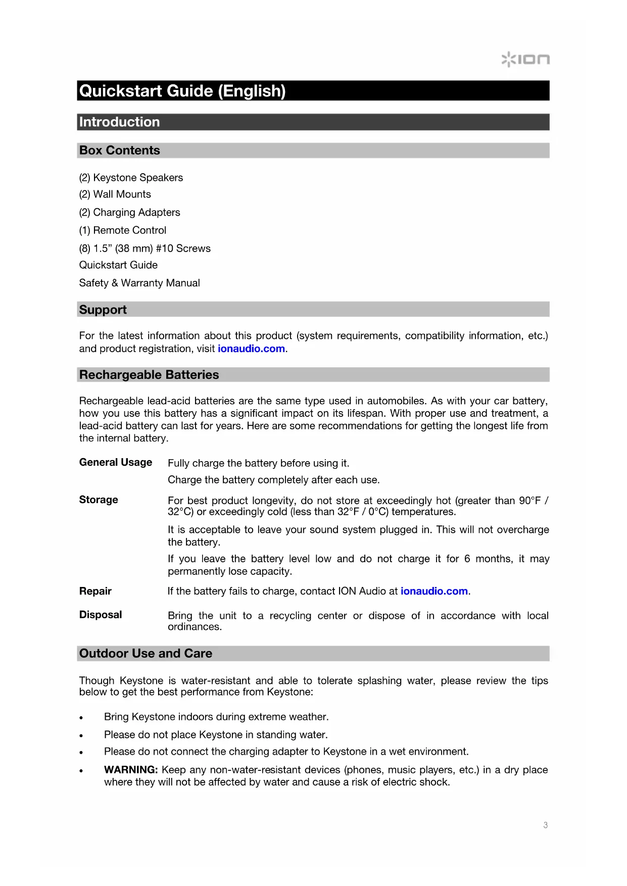 Quickstart Guide (English) Introduction Box Contents (2) Keystone Speakers (2) Wall Mounts (2) Charging Adapters (1) Remote Control (8) 1.5” (38 mm) #10 Screws Quickstart Guide Safety & Warranty Manual Support For the latest information about this product (system requirements, compatibility information, etc.) and product registration, visit ionaudio.com. Rechargeable Batteries Rechargeable lead-acid batteries are the same type used in automobiles. As with your car battery, how you use this battery has a significant impact on its lifespan. With proper use and treatment, a lead-acid battery can last for years. Here are some recommendations for getting the longest life from the internal battery. General Usage Fully charge the battery before using it. Charge the battery completely after each use. Storage For best product longevity, do not store at exceedingly hot (greater than 90°F / 32°C) or exceedingly cold (less than 32°F / 0°C) temperatures. It is acceptable to leave your sound system plugged in. This will not overcharge the battery. If you leave the battery level low and do not charge it for 6 months, it may permanently lose capacity. Repair If the battery fails to charge, contact ION Audio at ionaudio.com. Disposal Bring the unit to a recycling center or dispose of in accordance with local ordinances. Outdoor Use and Care Though Keystone is water-resistant and able to tolerate splashing water, please review the tips below to get the best performance from Keystone:
