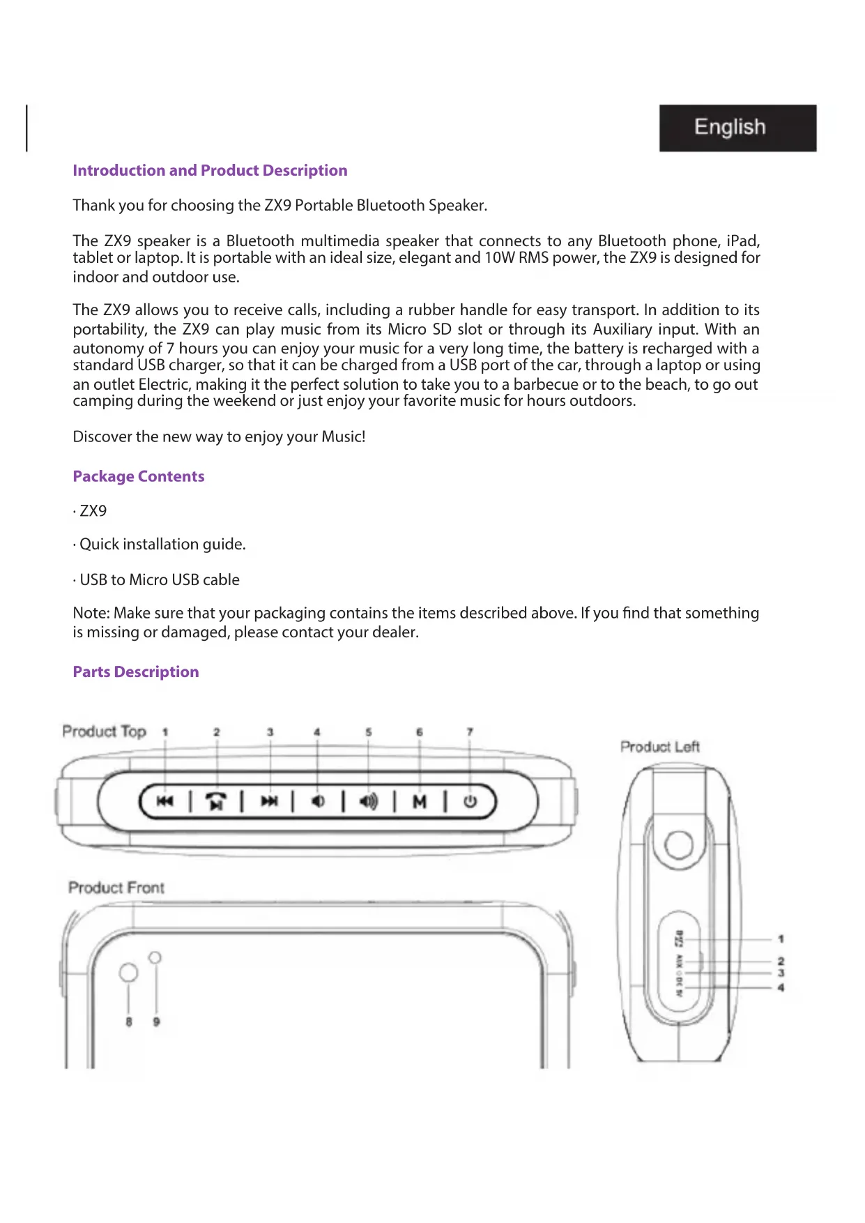Τεχνική υποστήριξη. Παρακαλούμε επισκεφθείτε την ιστοσελίδα μας www.billowtechnology.com για περισσότερες πληροφορίες σχετικά με την εγκατάσταση και τη διαμόρφωση αυτού του προϊόντος.Introduction and Product Description Thank you for choosing the ZX9 Portable Bluetooth Speaker. The ZX9 speaker is a Bluetooth multimedia speaker that connects to any Bluetooth phone, iPad, tablet or laptop. It is portable with an ideal size, elegant and 10W RMS power, the ZX9 is designed for indoor and outdoor use. The ZX9 allows you to receive calls, including a rubber handle for easy transport. In addition to its portability, the ZX9 can play music from its Micro SD slot or through its Auxiliary input. With an autonomy of 7 hours you can enjoy your music for a very long time, the battery is recharged with a standard USB charger, so that it can be charged from a USB port of the car, through a laptop or using an outlet Electric, making it the perfect solution to take you to a barbecue or to the beach, to go out camping during the weekend or just enjoy your favorite music for hours outdoors. Discover the new way to enjoy your Music! Package Contents